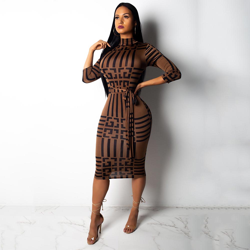 Women Sexy Turtleneck Short Sleeve Print Bodycon Midi DressSPECIFICATIONS