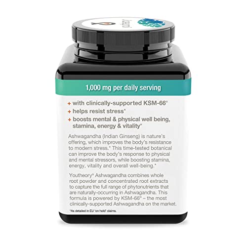 Details: Youtheory Ashwagandha 1000mg: Promotes calm and clarity Ashwagandha (Indian ginseng) is nature antidote to modern stress. This time-tested botanical greatly improves the body response to physical and mental stressors, while boosting stamina, endurance, cognitive health and overall well-being. Promotes calm and clarity with clinically-supported KSM-66 helps reduce stress Helps maintain normal cortisol levels. Boosts mental & physical performance