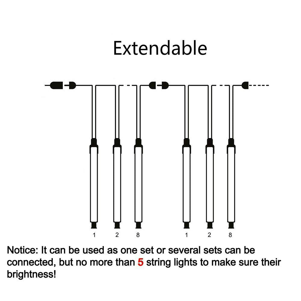 - 【Decorative Range】The length of the 1st tube to the 8th tube is 9ft, it means the decorative length of this icicle lights is 9ft, if you want to decorate a straight object, such as eaves, patio, please measure the size of the it and then decide how many sets you want. If you want to decorate an outdoor tree, we can't give precise advice, it depends on the decorative effect you want and the size of the trees, usually 3-4 strings can have a nice visual effect for a small tree.