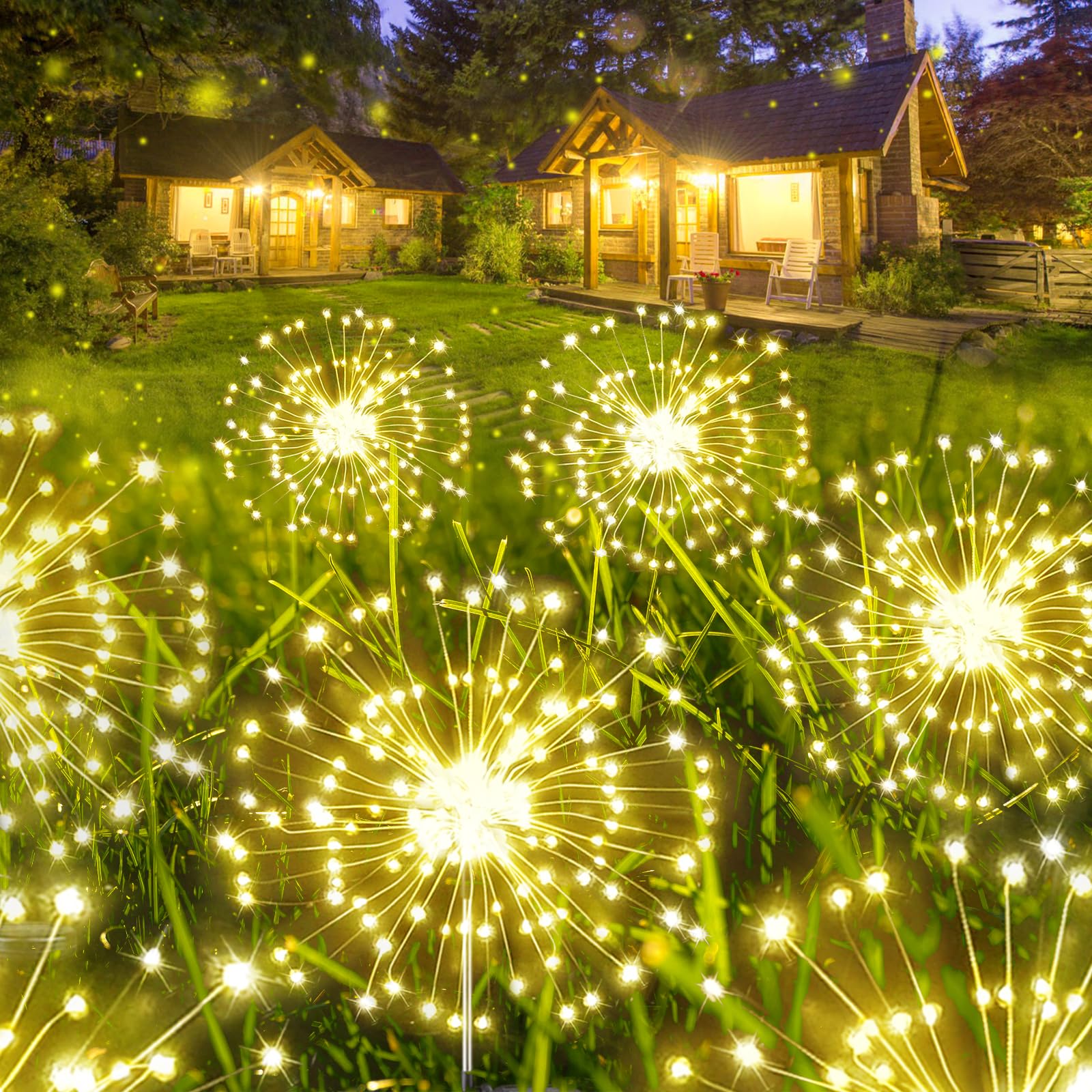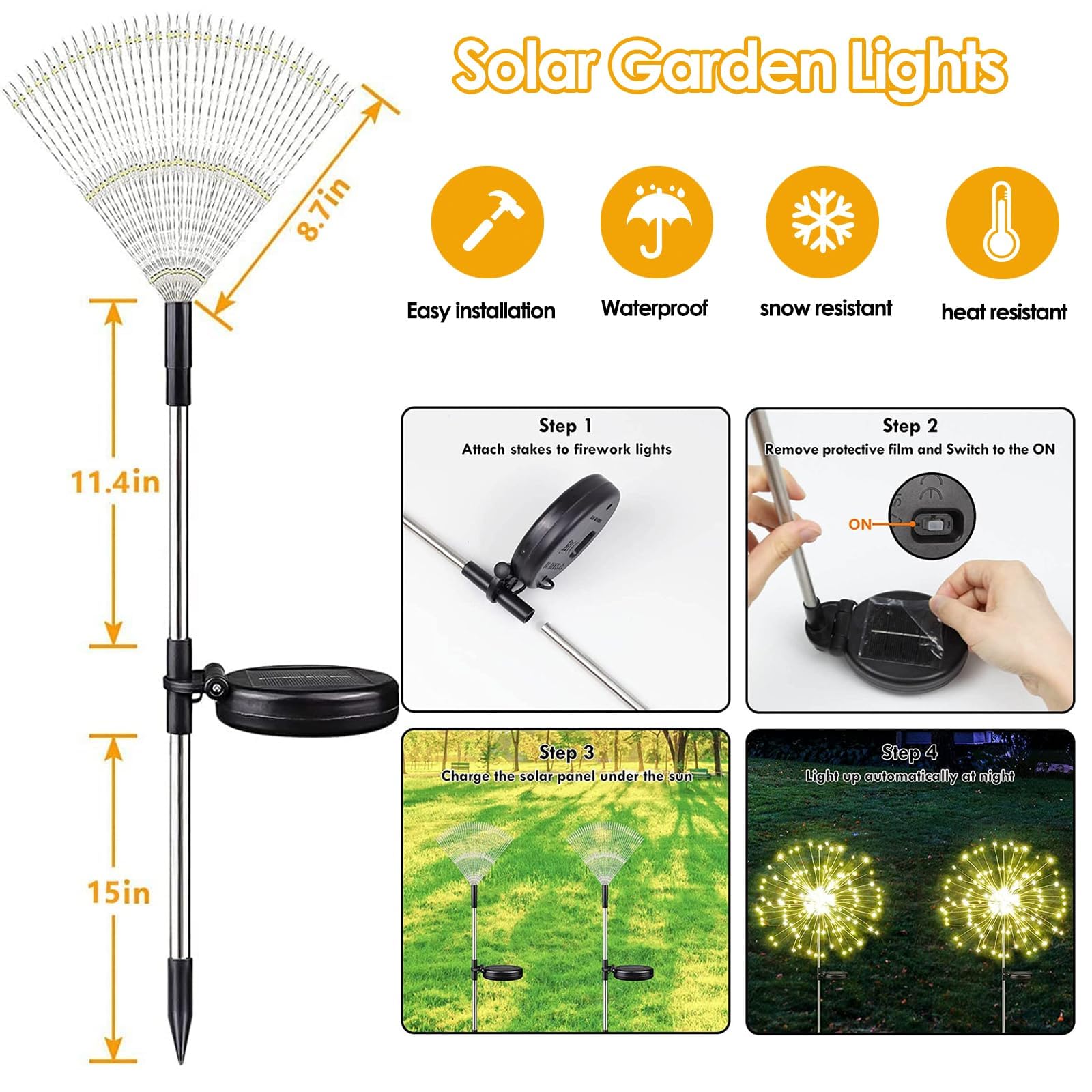 - 【DIY any Shape & Widely Used Outdoor Garden Decor】: The firework solar lights have a flexible string that can be shaped by yourself, such as fireworks, flowers, hearts, spiral, spherical, etc. It's a perfect holiday decoration for Landscape, Garden, Yard, Driveway, Pathway, Walkway, Holiday Decorations, and so on.