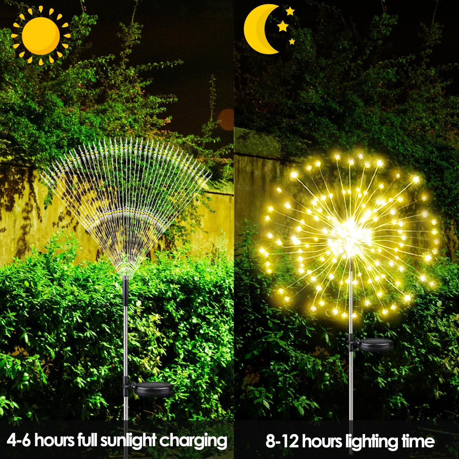 - 【Waterproof & Energy Saving & High Efficiency】:Solar firework light is suitable for all kinds of weather, Larger Capacity Built-in Battery and Larger Size Upgrade Waterproof Solar Panel for long-lasting use. Light up 12 hours after fully charged. Charging time: 8 hours under sunlight.