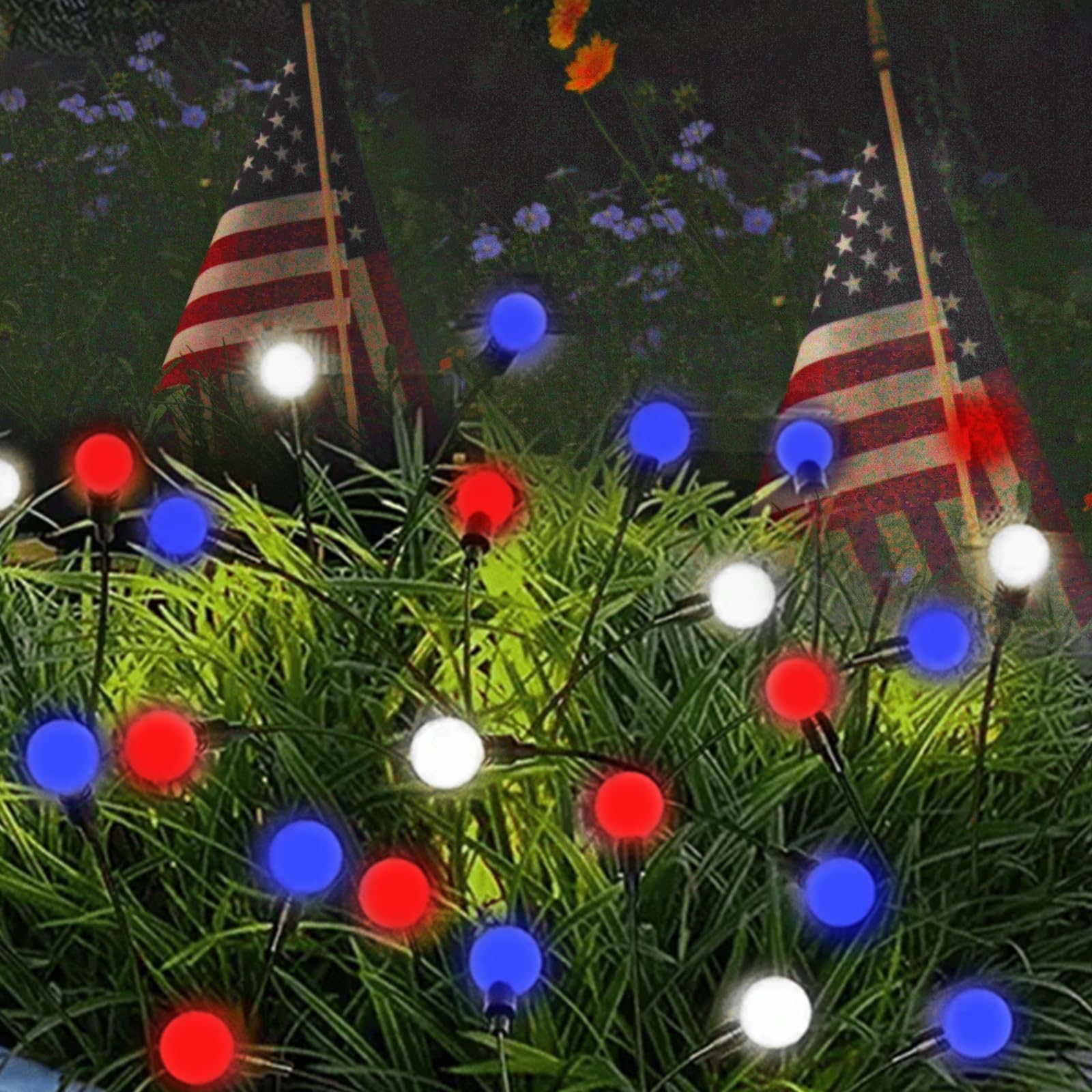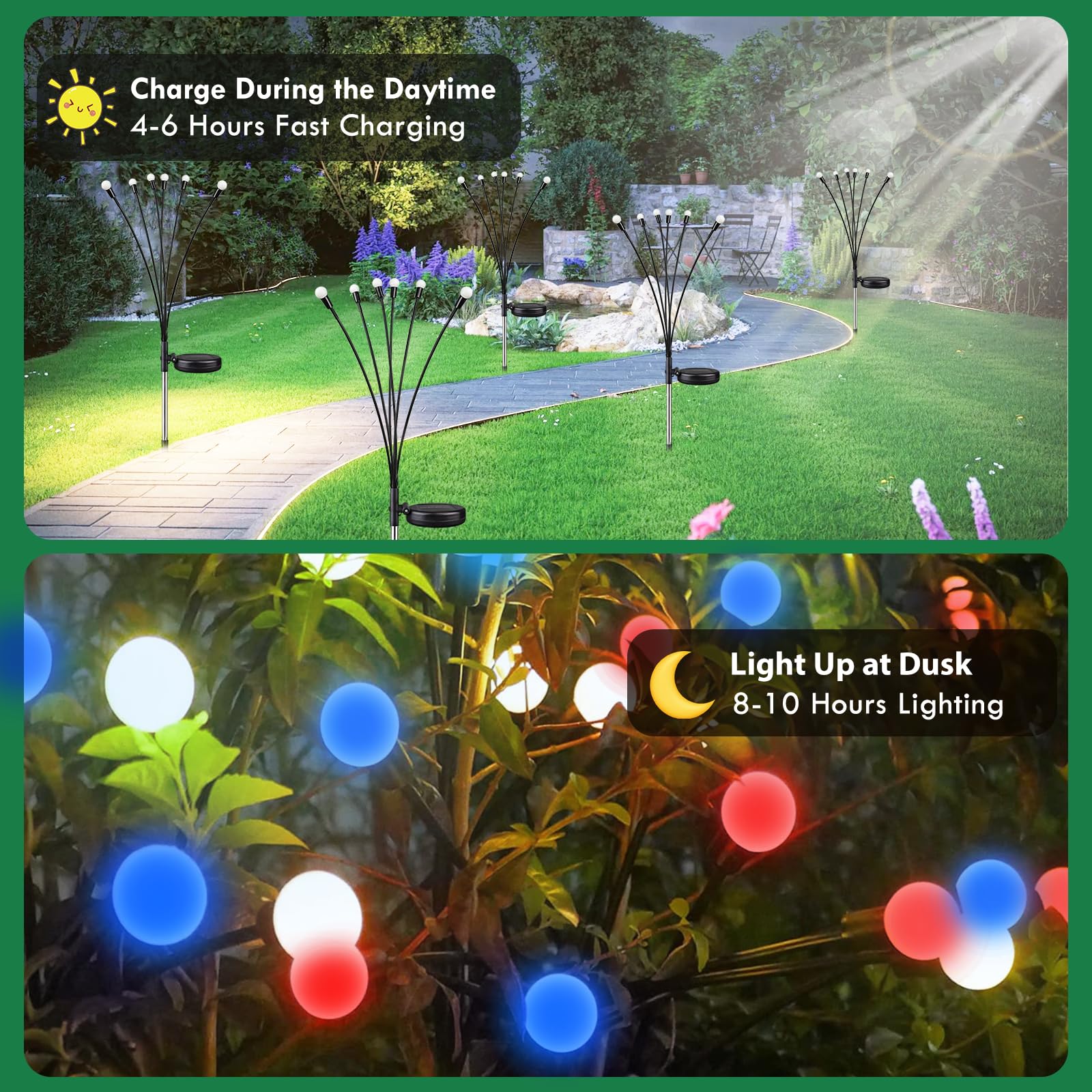 - 【Widely Used for Decoration】 With the unique bright romantic color, red blue and white, the solar firefly lights are perfect for 4th of July decor, also suitable for garden, patio, pathway, yard, backyard, front yard, park, potted plants and landscape decoration outdoor. It can bring a fantastic experience for Independence Day, Christmas, New Year, Wedding, party and other occasions.