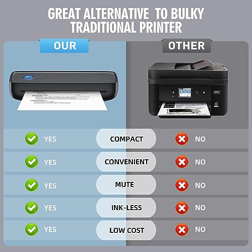 - Inkless Printer-No ink, low noise, environmental protection: Mini Printers use thermal technology - no ink, toner or ribbon needed, no ink related clogging and cleaning issues, no need to change any ink etc., low printing cost, and convenient and environmentally friendly, you only need to replace the thermal paper. It's also quieter than traditional printers.