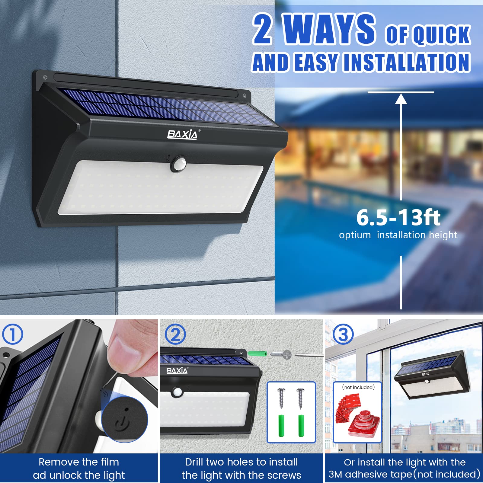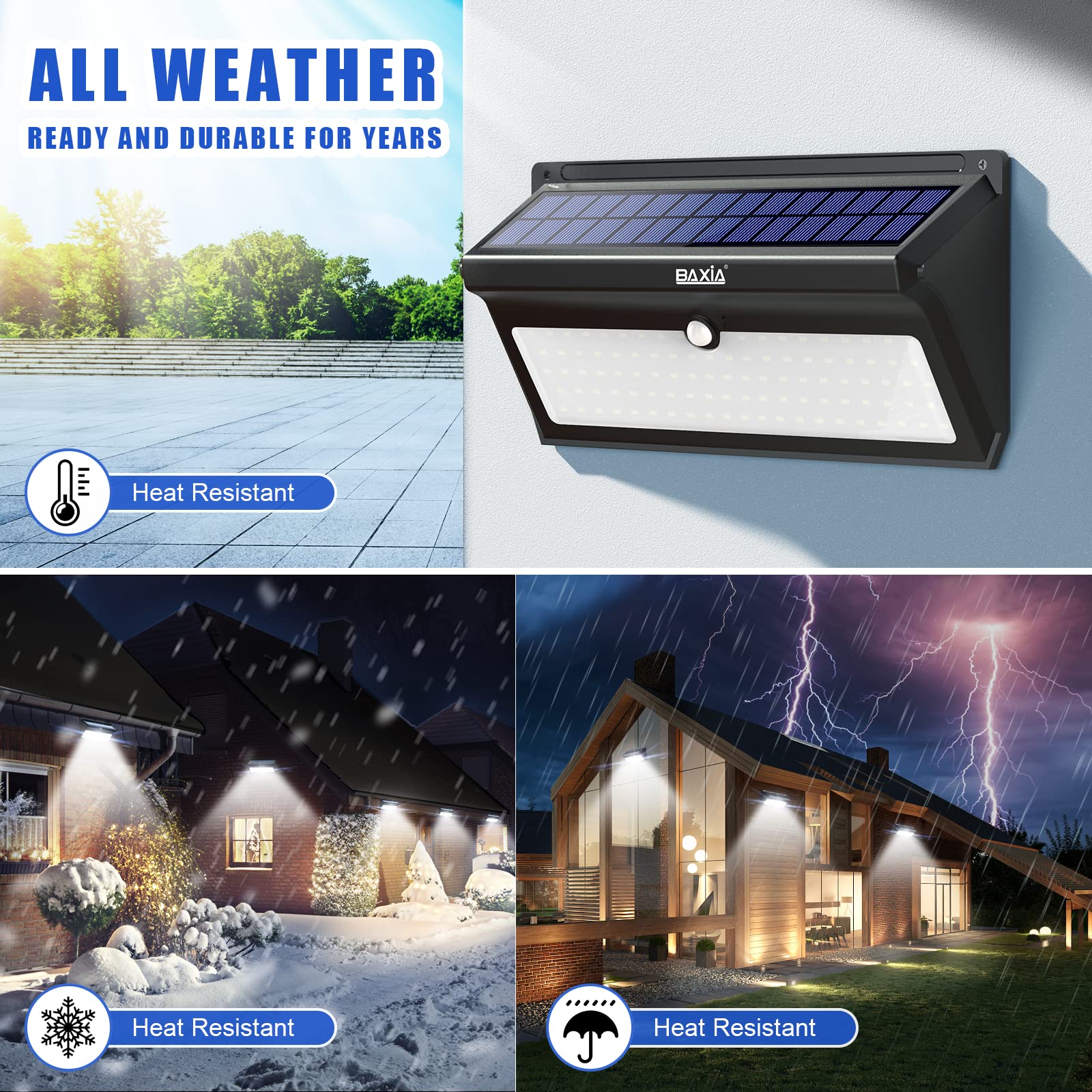 • ☀【2000 Lumens Bright Solar Light】 Brighter 100 LED beads equipped, our Baxia solar lights are so bright and sensitive that they can perfectly meet both your security and lighting requirements. You will want them mounted to your outdoor wall, or for front door, backyard, and of course for garden fence, stairs, pathway, etc.