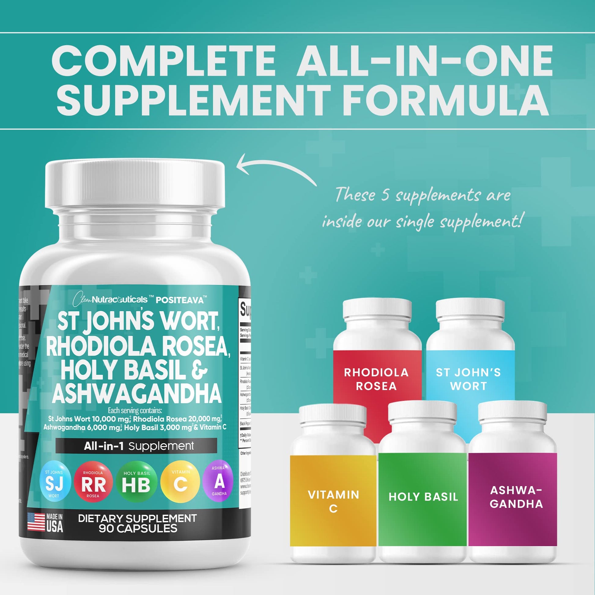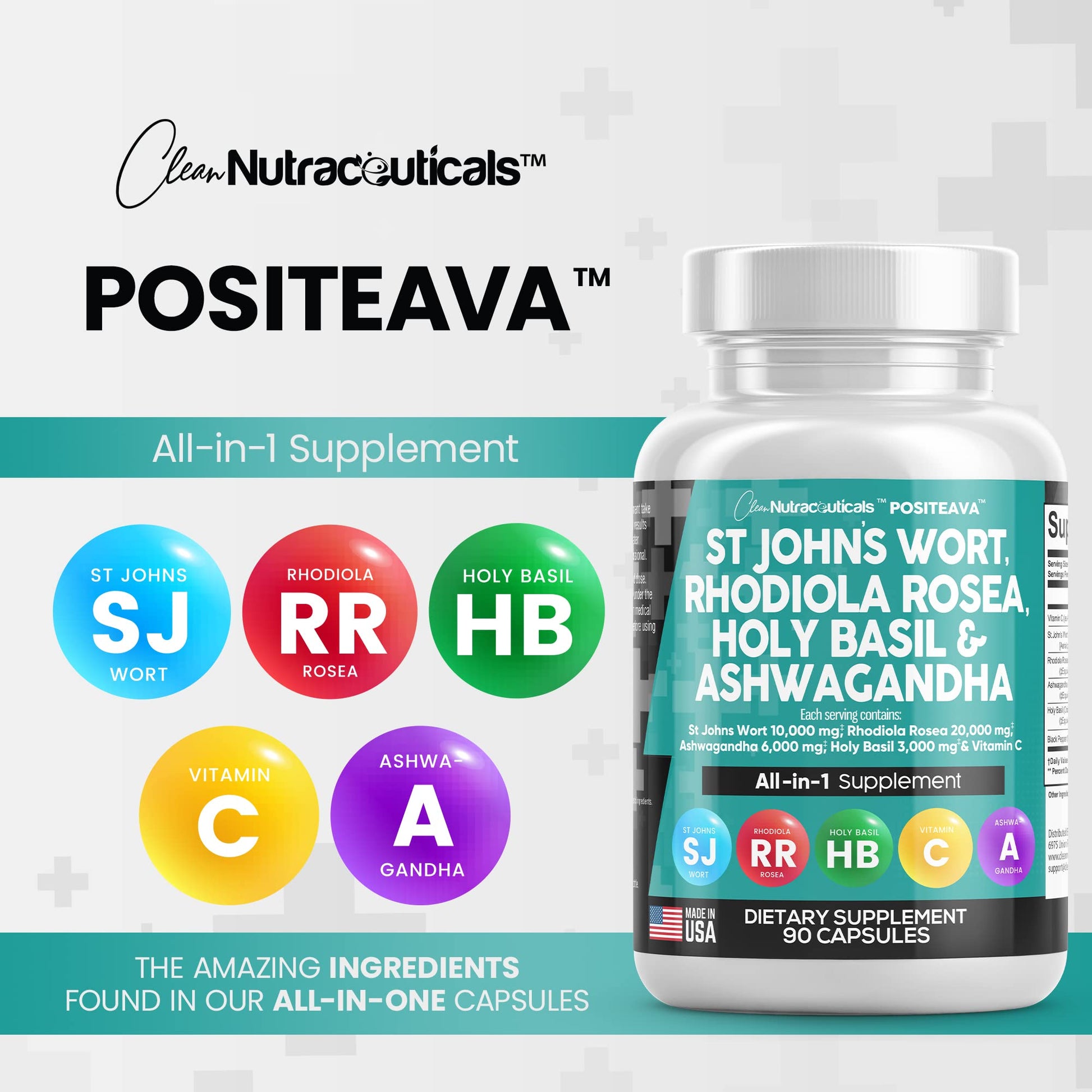 - The Ultimate St. Johns Wort Capsules & Ashwagandha Capsules You've Been Looking For - Clean Nutra Positeava provides 4 full-dose products in one support complex containing a full St Johns Wart, Rhodiola Rosea Supplement, Ashwagandha Pills, and Holy Basil Leaf. in a convenient 3 capsule dosage. Finally Saint Johns Wort Capsules, Rhodiola Extract Capsules and an Ashwagandha Supplement have been packed into one simple solution.