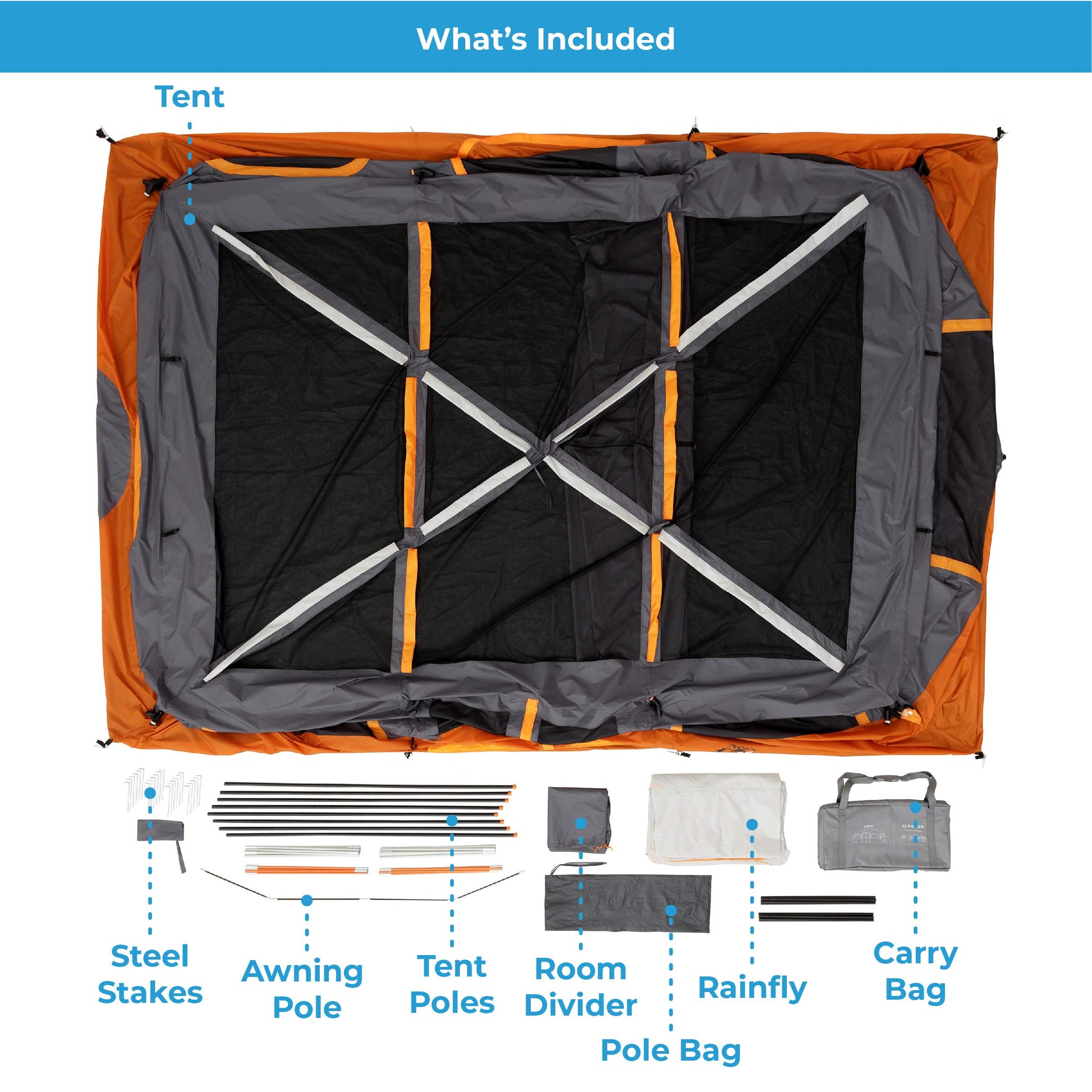 - WHAT’S IN THE BAG: The bag includes a tent, rainfly with attached guylines, room divider, poles, tent stakes, and a convenient carry bag. With everything provided, you'll have everything you need to enjoy your outdoor experience.