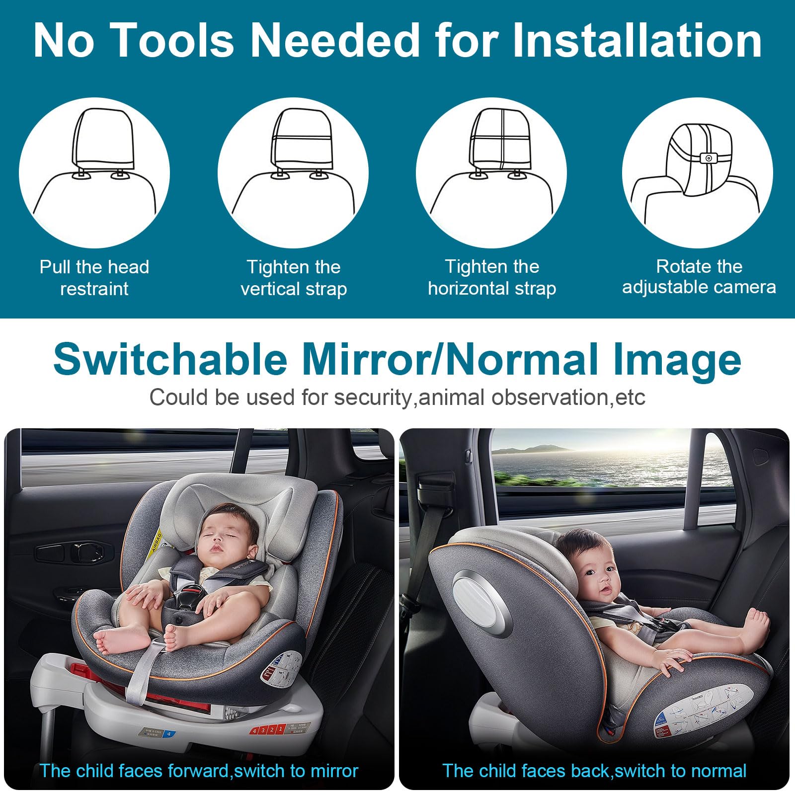 - HD 1080P Image: Using the upgraded chip technology,baby camera for car can provide crystal clear pictures no matter in the day or at night. With two infrared night vision lights,baby car mirror camera system can protect the baby’s eyes. And baby carseat camera will increase vehicle safety index without looking back and provide parents with peace of mind while travel driving.