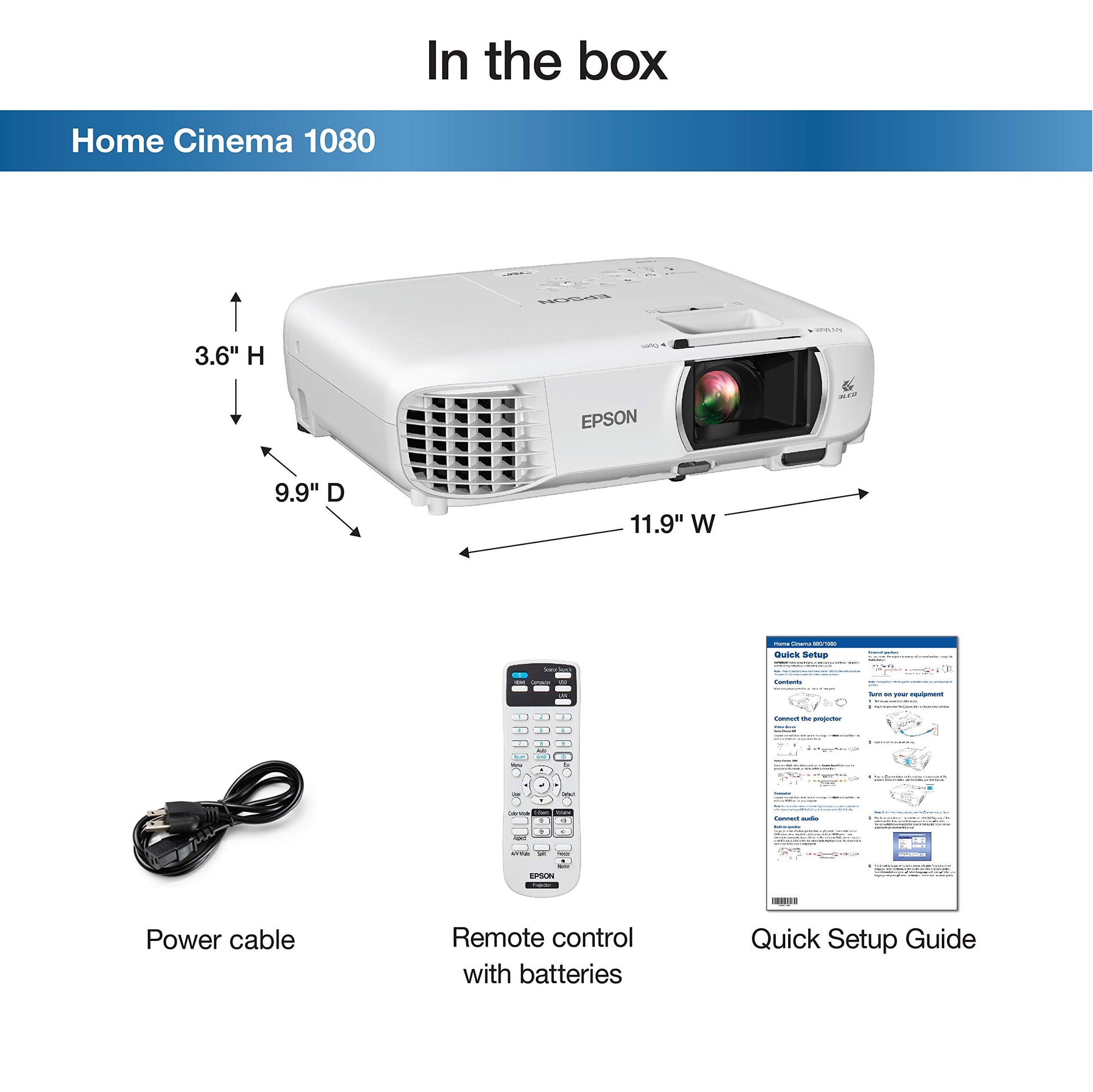 Details: "Enhance your home theater with state-of-the-art projection. Featuring proprietary core technologies, the Home Cinema 1080 delivers an astounding 1080p picture up to 320"" on virtually any blank wall or screen. Whether you’re binge-watching your favorite TV show or watching the big game, this dynamic, versatile projector provides a stunning, larger-than-life viewing experience with true 3-chip, 3LCD technology, Best-in-Class Color Brightness (1) and fast data processing. And, with versatile connectivity and easy setup, you get immersive HD entertainment right out of the box — simply power on the projector and start streaming games, movies and more (2).1. Color brightness measured per IDMS 15.4. Additional colors and picture modes tested. Top-selling Epson 3LCD projectors vs. comparable top-selling 1-chip DLP projectors based on NPD sales data for May 2017 – April 2018. COLOR BRIGHTNESS WILL VARY BASED ON USAGE CONDITIONS.2. Some apps require paid subscriptions.3. Color brightness (color light output) and white brightness (white light output) will vary depending on usage conditions. Color light output measured in accordance with IDMS 15.4; white light output measured in accordance with ISO 21118.4. For convenient and reasonable recycling options. SmartWay is an innovative partnership of the U.S. Environmental Protection Agency that reduces greenhouse gases and other air pollutants and improves fuel efficiency".