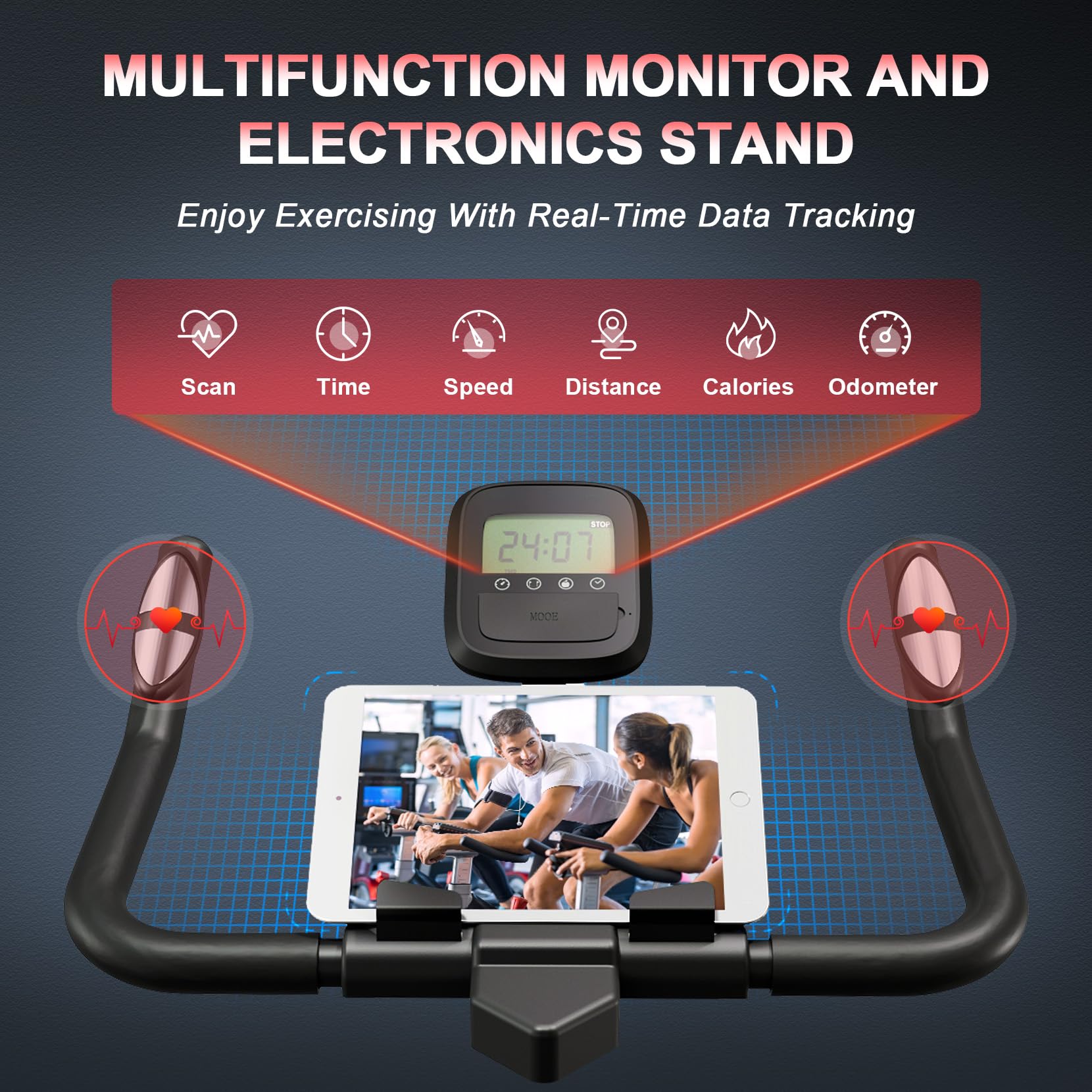 - 👍【LCD MONITOR WITH IPAD HOLDER】 The LCD digital monitor can track your real-time exercise time, speed, distance, heart rate, calories burned, and odometer, and then you will be able to adjust your exercise plan timely. The phone holder allows you to watch videos with your mobile devices when exercising. Equipped with a water bottle holder you can replenish water at any time.
