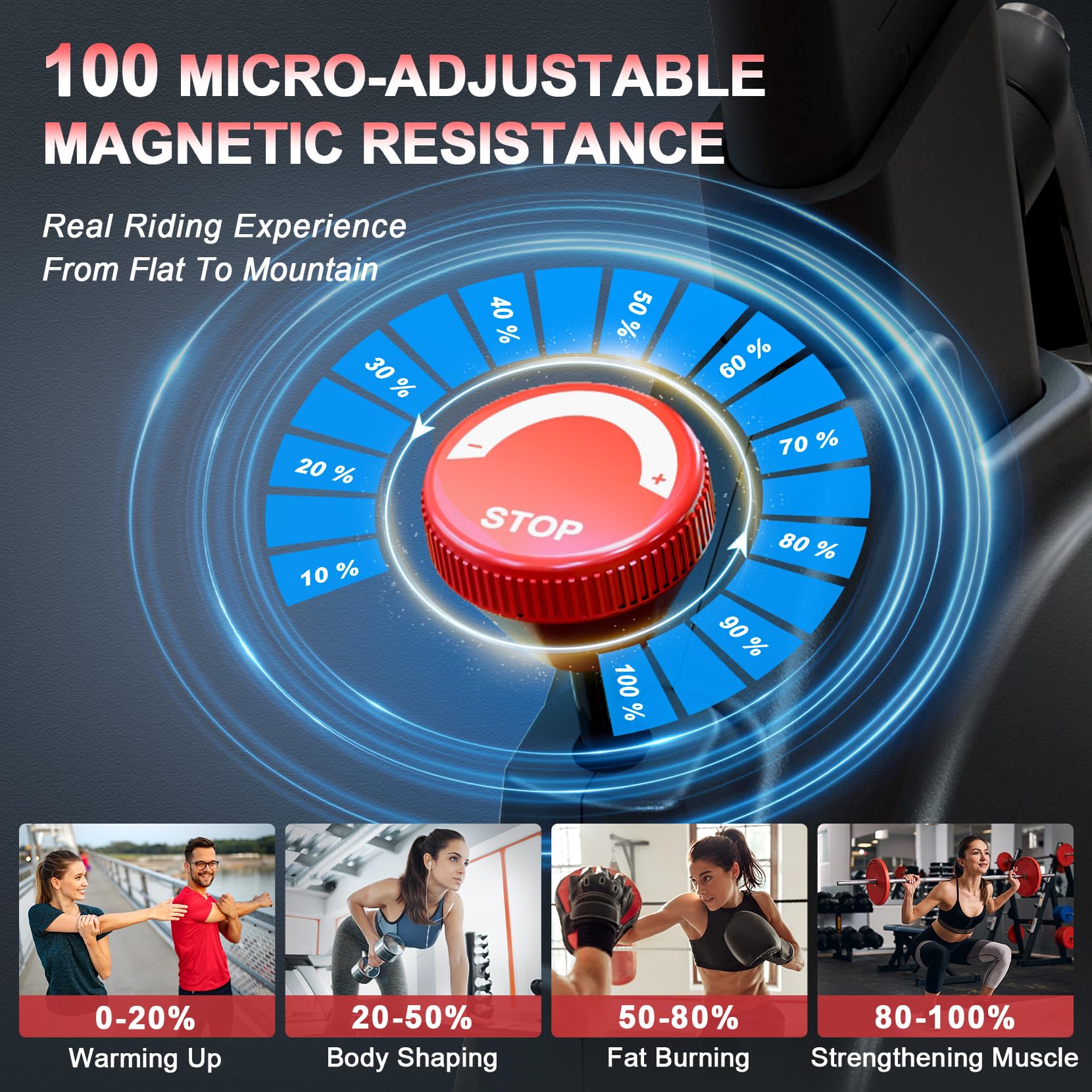- 👍【100-LEVEL MAGNETIC RESISTANCE BRAKING】 Unlike other brakes that use wool felt, the Dripex workout bike uses magnetic resistance micro-electricity for braking, which does not come into direct contact with the flywheel, has no wear and maintenance and achieves quiet exercise below 20dB. 0-100% brake adjustment is suitable for any of your workout needs including warm-up, weight loss, post-surgery recovery, and more. Just press the emergency brake at the touch of a button.