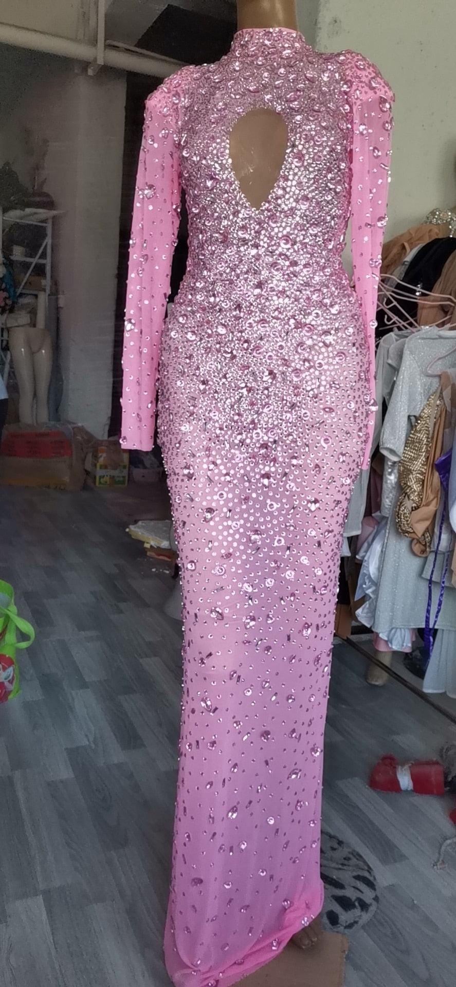 Flashing Silver Crystals Stones Sexy Transparent Long Dress Evening Birthday Celebrate Mesh Stretch Dance Long Sleeves DressSPECIFICATIONS