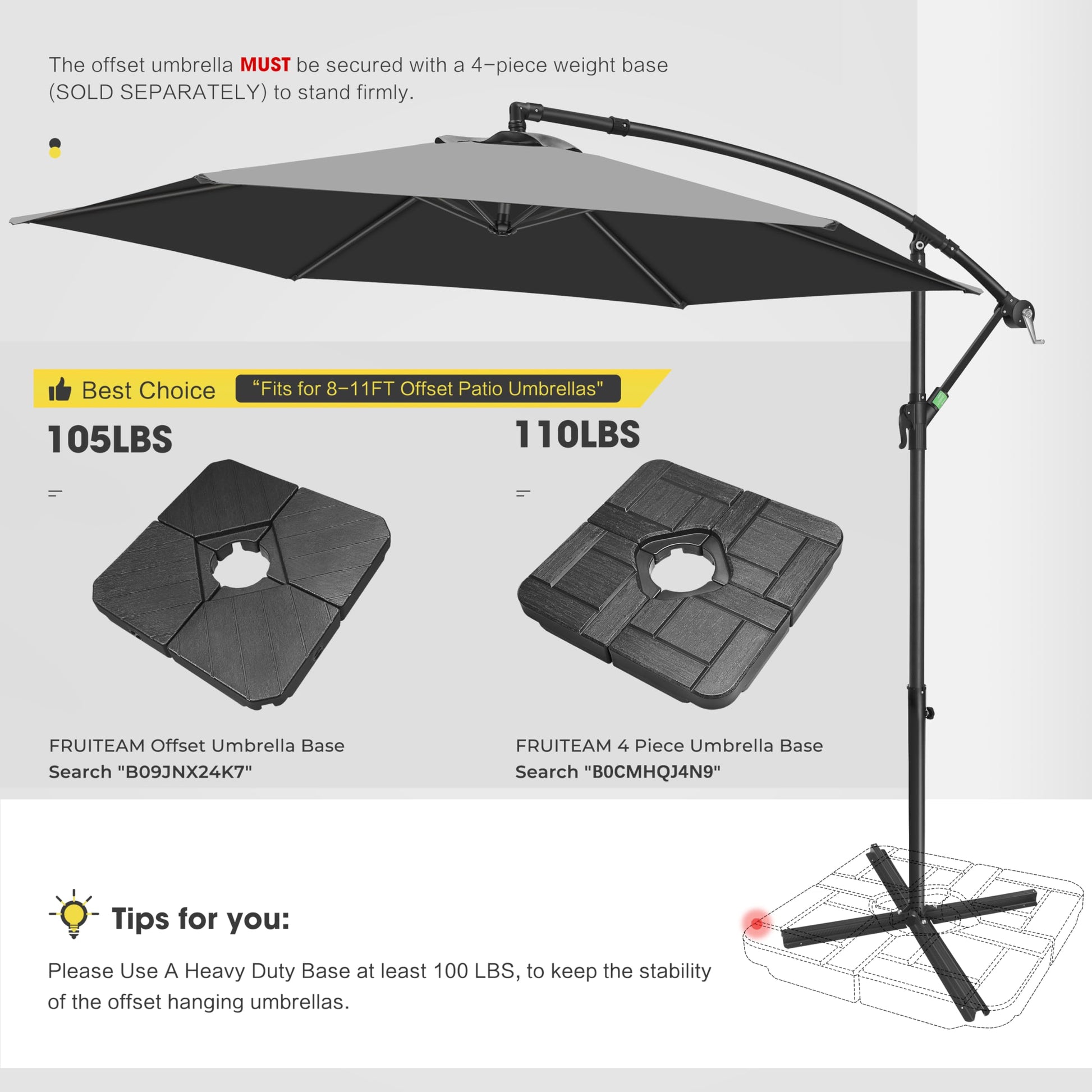 - CUATION, CARE & WARRANTY - Purchase the suitable weighted base as a support for the patio offset umbrella. (Please search FRUITEAM Umbrella Base 4pcs or enter FRUITEAM store) And we provide 12-month warranty service for you. If you need any support, please contact us directly