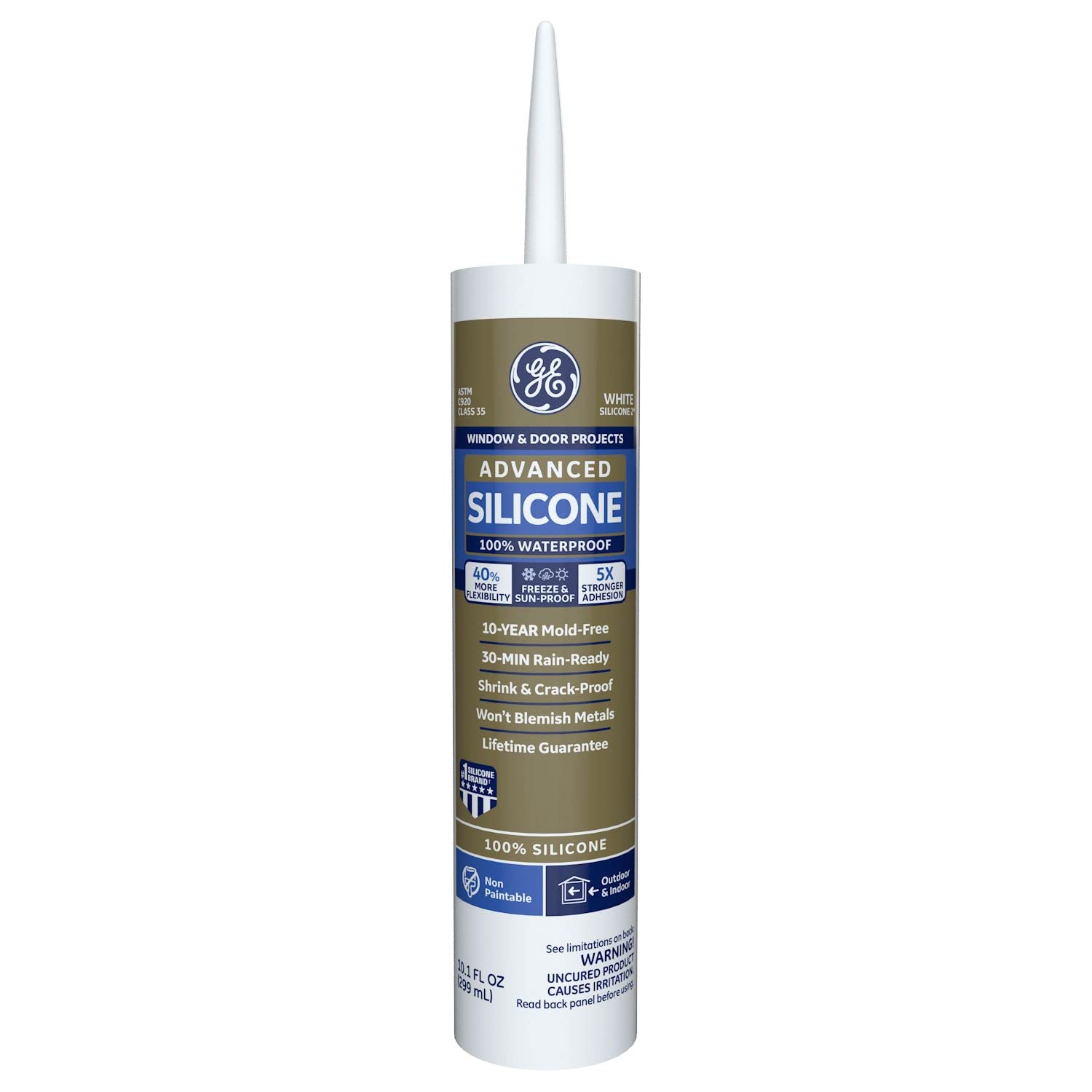 GE Advanced Silicone Caulk for Window & Door - 100% Waterproof Silicone Sealant, 5X Stronger Adhesion, Shrink & Crack Proof - 10 oz Cartridge, Clear, Pack of 1