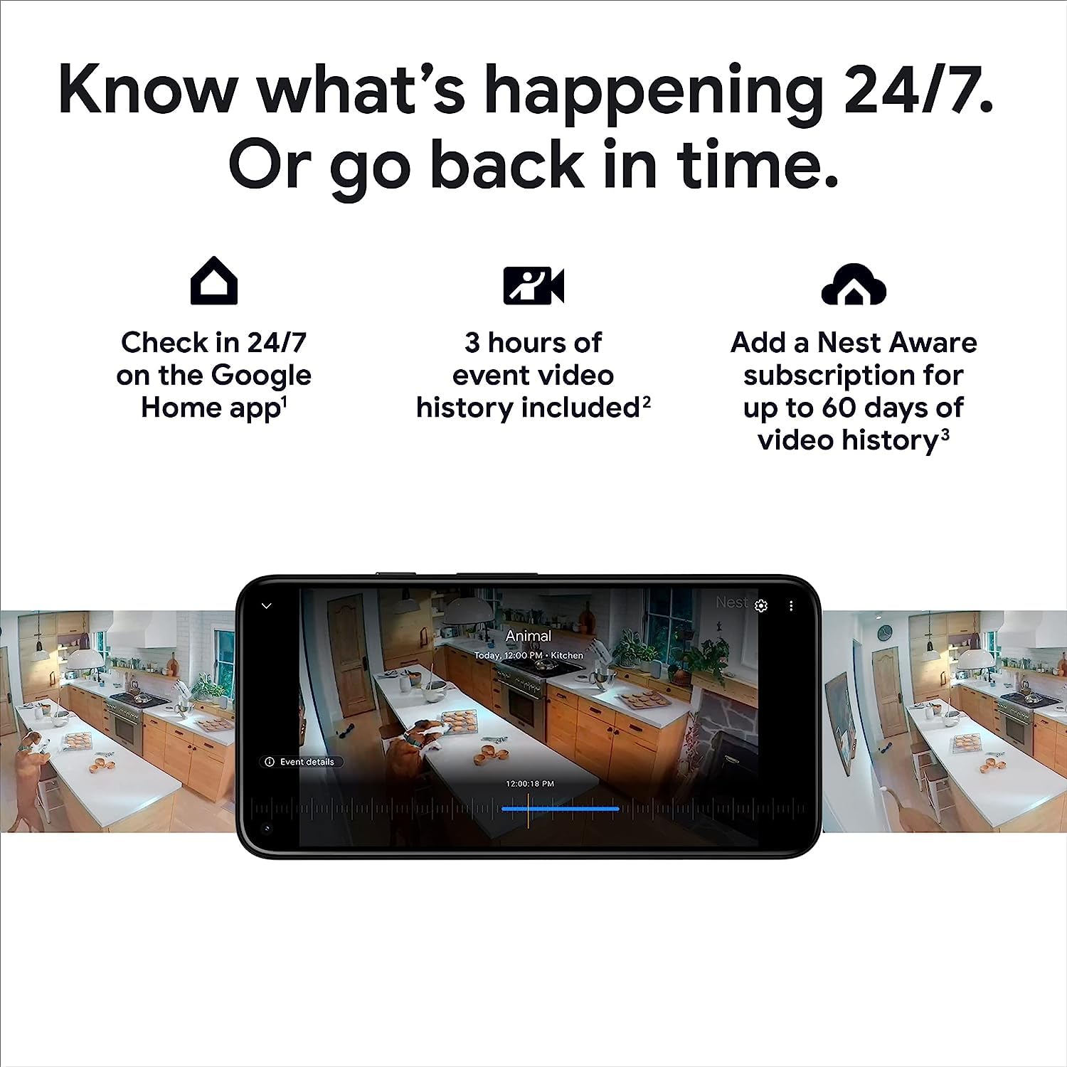 - Easily check in from anywhere 24/7 with 1080p HDR video[1] with night vision, and see what you missed with 3 hours of free event video history[2]; add a Nest Aware subscription (sold separately) for up to 60 days of video history[3]