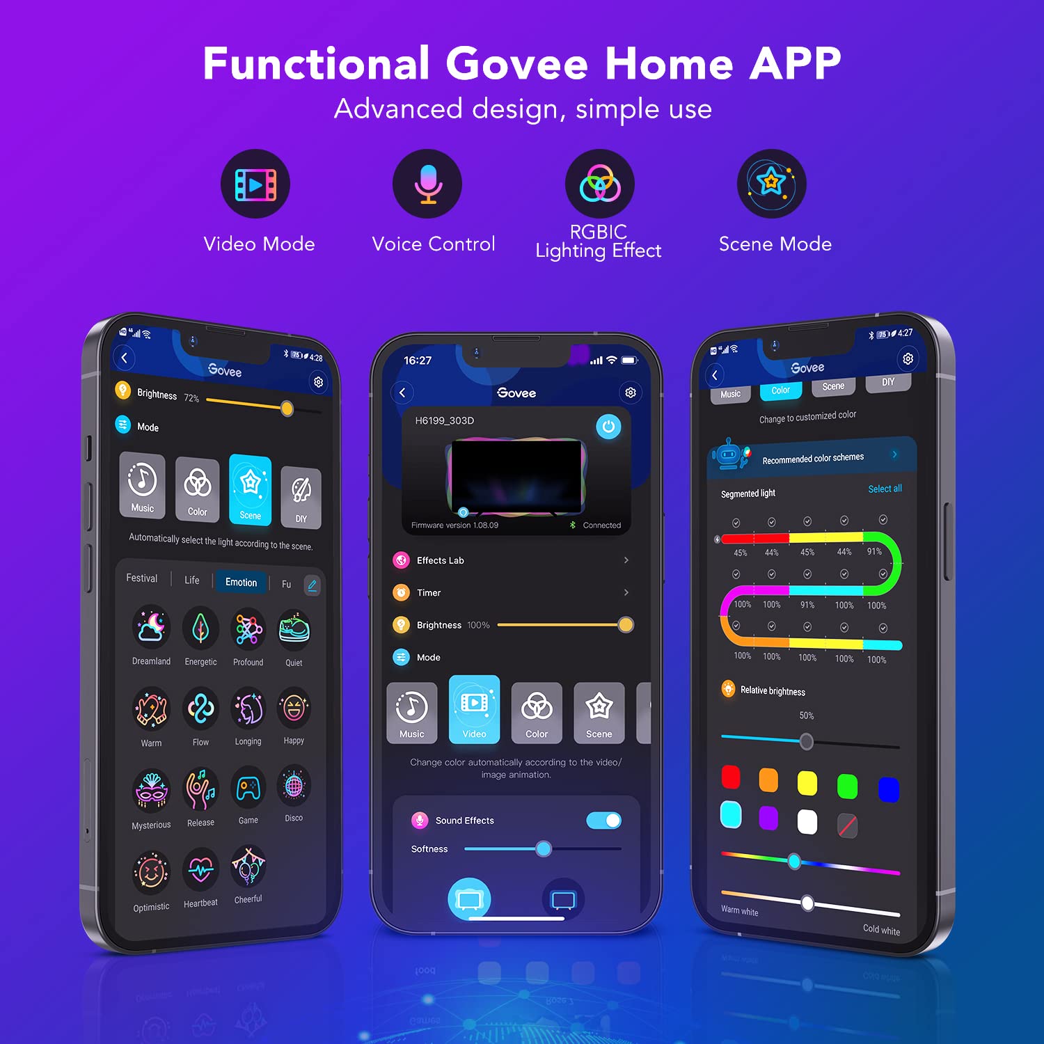 - Smart Voice Control: Manage your LED lights for TV with simple voice commands, via Alexa and Google Assistant, or with the Govee Home app. Enjoy access to more colors and features like Timer, Video, DIY and Music mode, helping you create the ambiance you need.