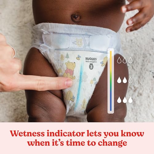 Details: With up to 12 hours of leak protection for your baby’s delicate skin, Huggies Little Snugglers Diapers are our perfect choice for your little one. Huggies Little Snugglers newborn diapers offer gentle skin protection and showcase a curved and stretchy fit with all-around comfort for a gentle tummy fit. These baby diapers feature Huggies' GentleAbsorb Liner that absorbs wetness on contact to help keep your baby’s skin clean and healthy. Plus, with a soft, pocketed back waistband, these disposable baby diapers help prevent leaks and blowouts while helping keep mess away from your baby's skin. Extra soft materials provide belly comfort and protection from red marks during Tummy Time. Little Snugglers baby diapers are made with a breathable outer cover and are hypoallergenic, dermatologist tested and safe for sensitive skin. Huggies is the only leading brand entirely fragrance free*, our diapers are also made without parabens, lotions, elemental chlorine and natural rubber latex. Little Snugglers also feature a color-changing wetness indicator that lets you know when your baby’s diaper is ready to be changed. Featuring Disney Winnie the Pooh designs, Little Snugglers Diapers are available in size Preemie (up to 6 lbs), size Newborn (up to 10 lbs), size 1 (8-14 lbs), size 2 (12-18 lbs), size 3 (16-28 lbs), size 4 (22-37 lbs), size 5 (27+ lbs) and size 6 (35+ lbs). For the perfect diapering duo, pair Huggies diapers with Huggies Natural Care Sensitive Baby Wipes! (*among leading national diaper brands, across all offered variants)