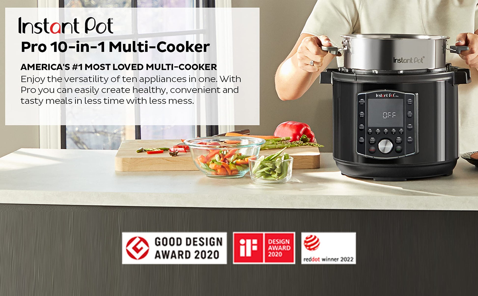 Details: Experience the next generation of convenience with Instant Pot® Pro. It starts with 28 smart cooking programs and adds 5 new Favorite program settings. Spend less time in the kitchen with 20% faster pre-heating and up to 70% faster cooking overall. It replaces 10 kitchen appliances: slow cooker, pressure cooker, sous vide, sauté pan, sterilizer, yogurt maker, food warmer, cake baker and steamer. The upgraded gentle steam release is quieter and less messy with the diffusing cover. And the Pro is filled with thoughtful extras like Easy Grip handles on the inner pot, a large LCD display that’s easy to read, and an auto-sealing lid. The Instant Pot Pro offers the quality, convenience and versatility you’ve come to expect from Instant – discover amazing. Included accessories: Accessories include an extra sealing ring and stainless-steel steamer rack with handles.