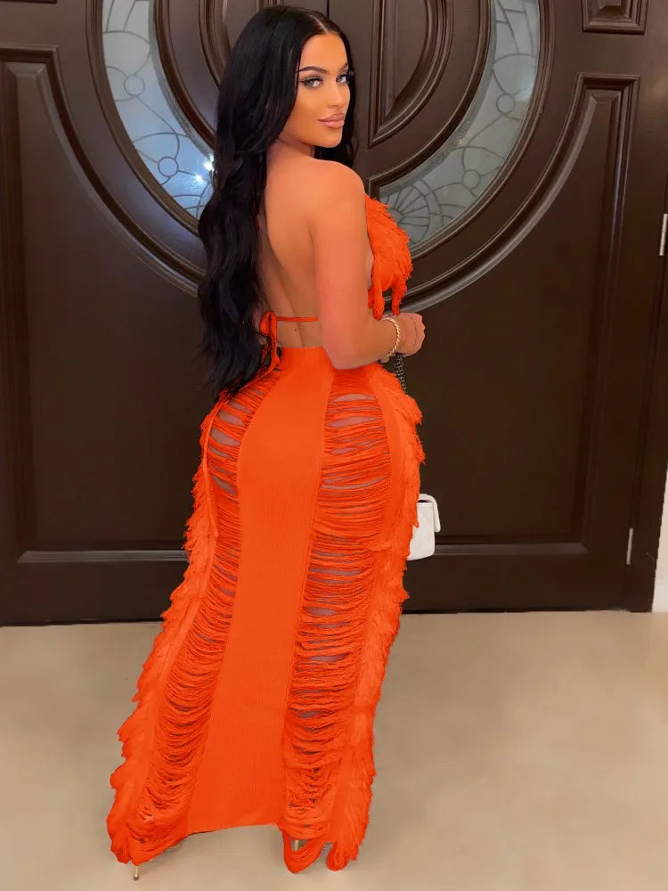 JRRY Sexy Women Knitted Set Halter Backless Crop Top Tassel Skirt Crochet Two Pieces Set Hollow Out Crocheted Beach Dress Set