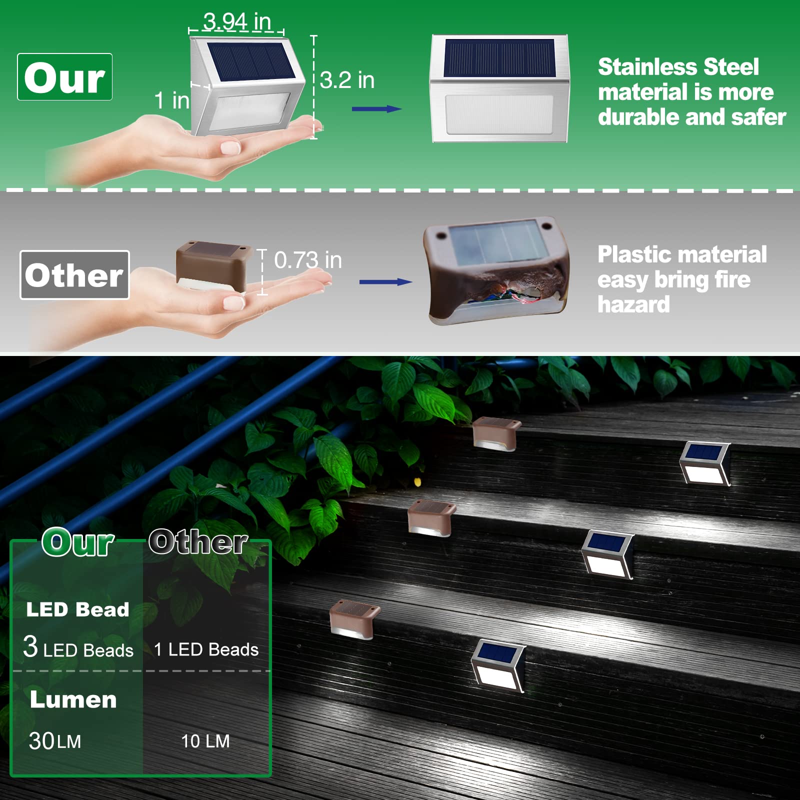 - High Efficiency-Durable Use: The solar deck light's panel made of high quality monocrystalline silicon, conversion up to 18%, long lasting support to light up till dawn.3 LED beads are not too dark and not too bright,light is not too harsh and will not affect your neighbors,enough for fence, deck railing, step, stairs, path, yard and garden, make your house more brighter and safer, don't worry about strangers approaching.