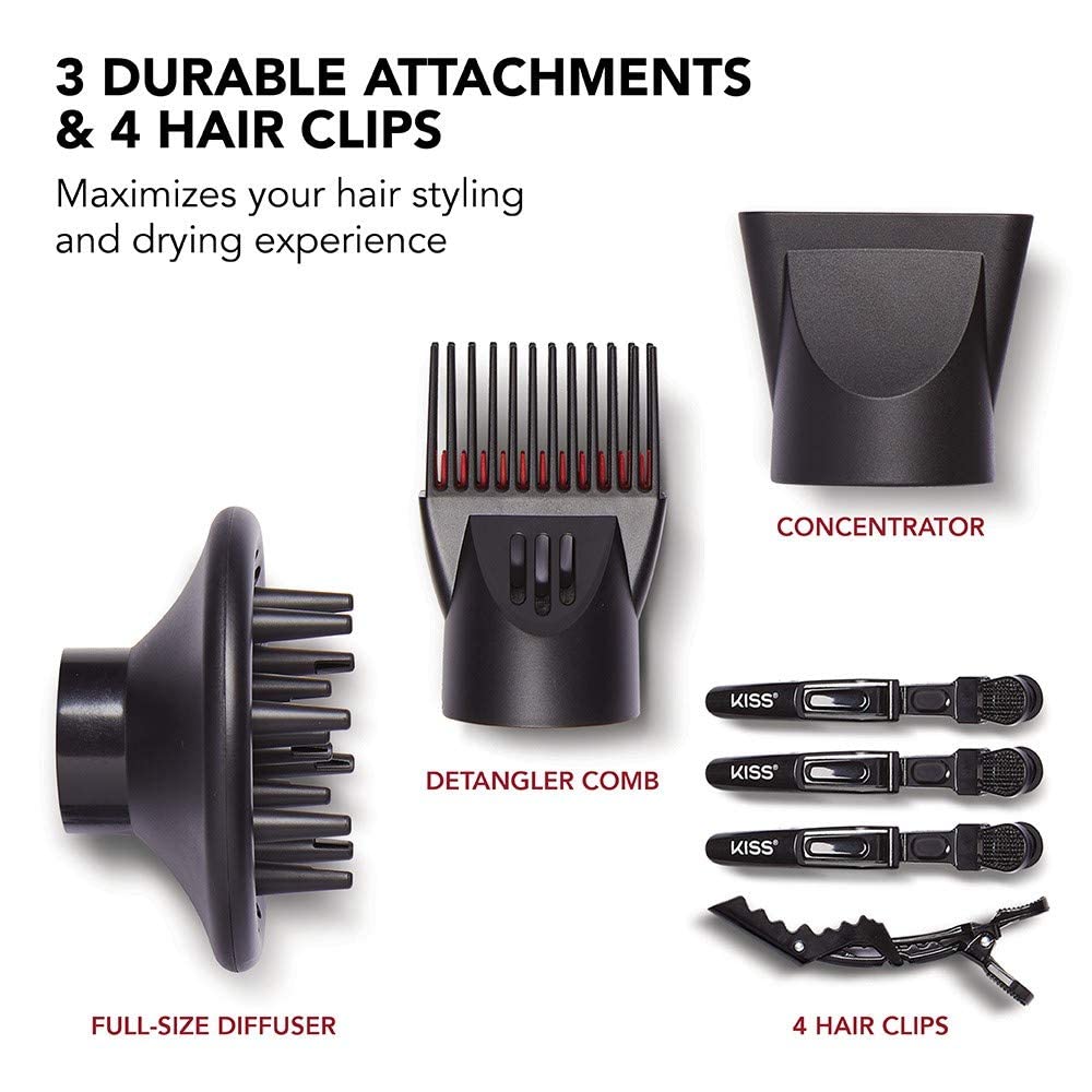 KISS 1875 Watt Pro Tourmaline Ceramic Hair Dryer, 3 Heat Settings, 2 Speed Slide Switch, Cool Shot Button, 2 Detangler Combs, 1 Concentrator, 1 Diffuser, Removable Filter Cap & 4 Sectioning Clips RedBrand: KISS
