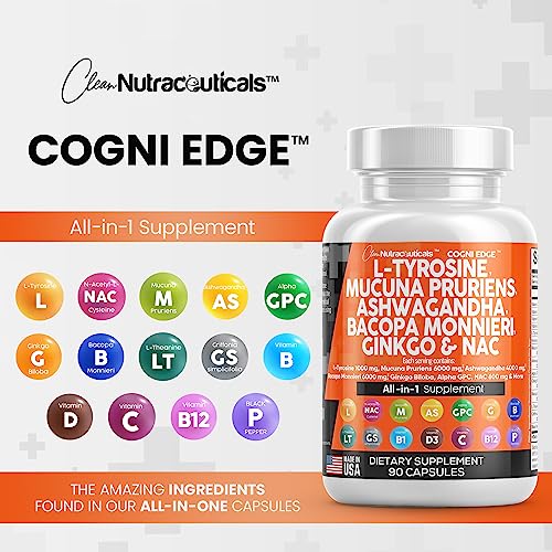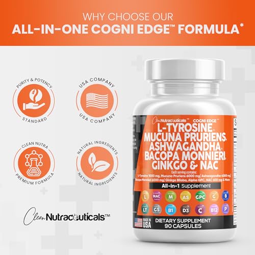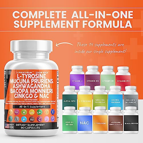 L-Tyrosine 1000mg Mucuna Pruriens 6000mg Bacopa Monnieri 500mg Ashwagandha 4000mg Focus Supplement with N-Acetyl Cysteine 600mg NAC 5-HTP Ginkgo Biloba Alpha GPC L Theanine Vitamin C D B1 B12 USA MadeBrand: Clean Nutraceuticals