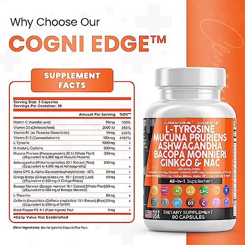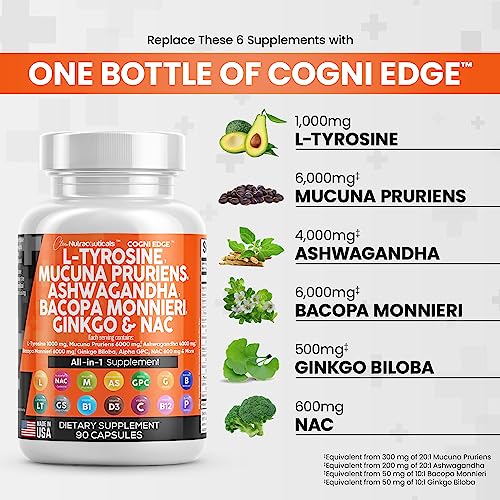 L-Tyrosine 1000mg Mucuna Pruriens 6000mg Bacopa Monnieri 500mg Ashwagandha 4000mg Focus Supplement with N-Acetyl Cysteine 600mg NAC 5-HTP Ginkgo Biloba Alpha GPC L Theanine Vitamin C D B1 B12 USA Made