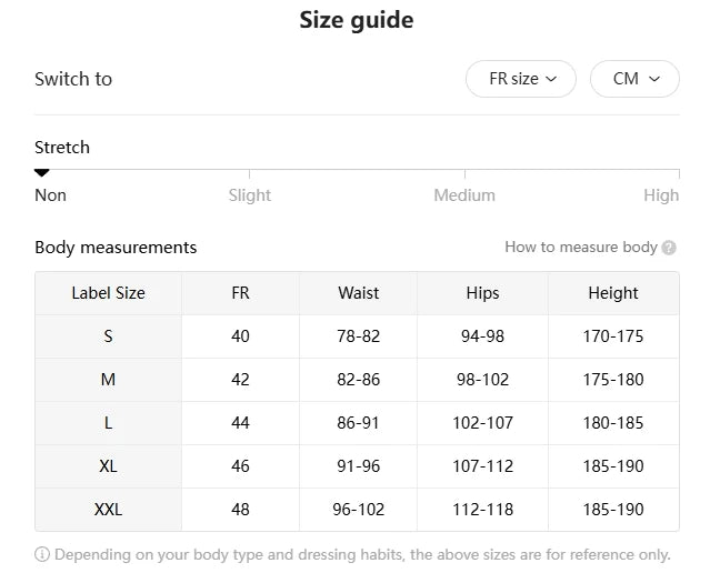size_info: {"sizeInfoList":[{"length":{"cm":"80","inch":"31.50"},"size":"S","vid":-1},{"length":{"cm":"84","inch":"33.07"},"size":"M","vid":-2},{"length":{"cm":"88","inch":"34.65"},"size":"L","vid":-3},{"length":{"cm":"92","inch":"36.22"},"size":"XL","vid":-4},{"length":{"cm":"98","inch":"38.58"},"size":"XXL","vid":-5}]}