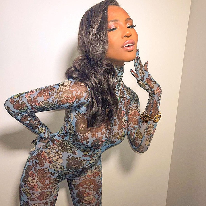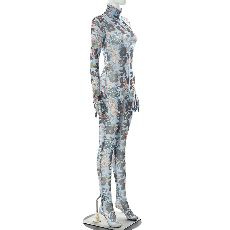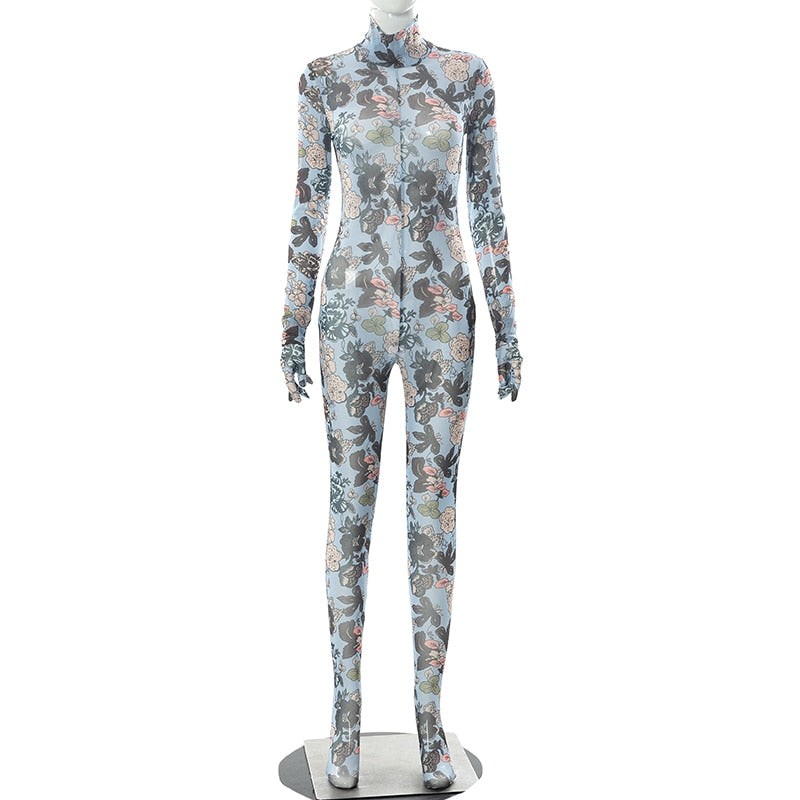 Mesh Turtleneck Jumpsuit With Floral Pattern Gloves See Through Bodycon Sheer Tight One Piece Catsuit Outfits Baddie