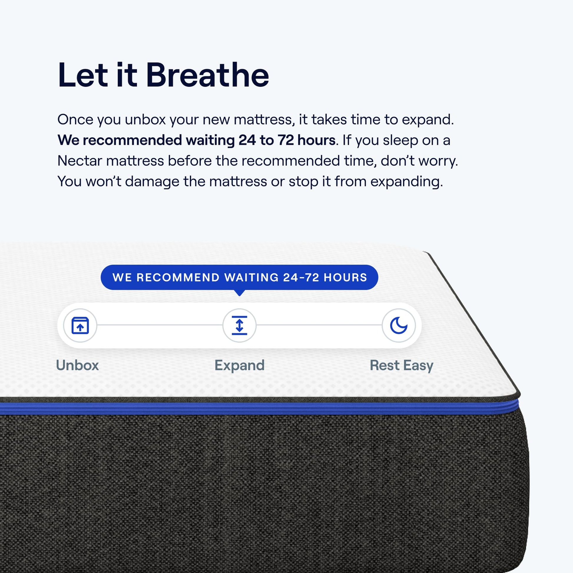 - SIMPLE TO SET UP - Just move the box to the room you want to use it in, unbox and unroll your mattress, and watch it expand before your eyes. Your Nectar will be snooze ready in 24 hours!