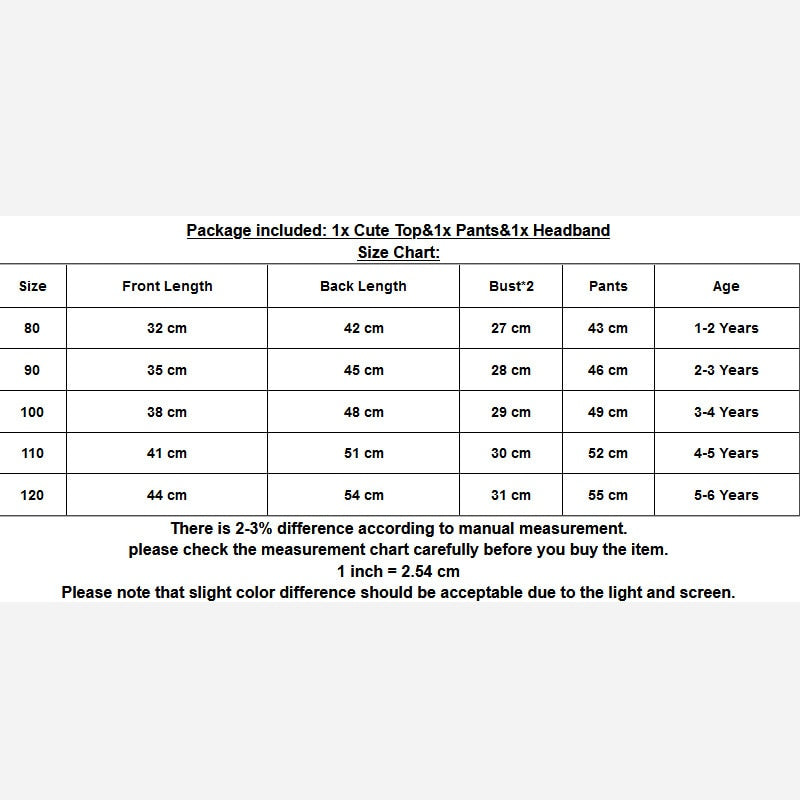 Package included: 1x Cute Top&1x Pants&1x Headband Size Chart: