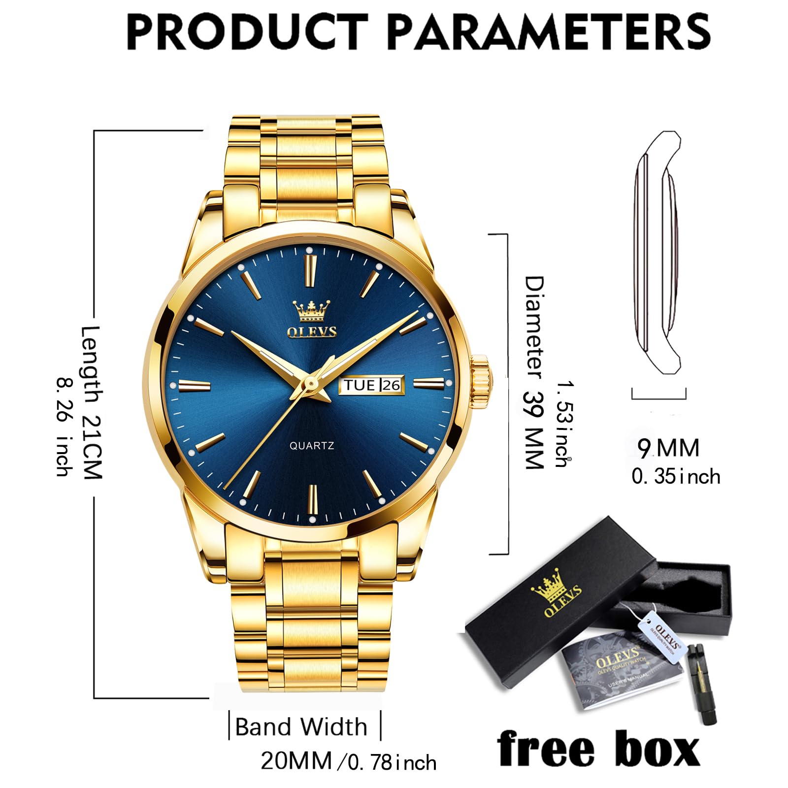 - 【Material 】Gold Men Watch with high quality Japanese quartz movement,scratch-resistant.Long lifespan,Guaranteed quality.Blue dial men watch thick 9MM(0.35 inch),Diameter 39MM(1.54 inches) ,Steel band Width 20mm, Length 21cm.Dress Men's Watch Weight 85G(2.998 ounces)