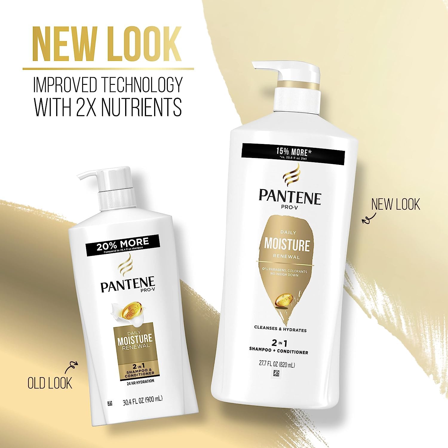 Details: HARD WORKING, LONG LASTING Your haircare should work as hard as you do. Pantene Daily Moisture Renewal 2-in-1 Shampoo + Conditioner twin pack cleanses and hydrates parched hair by removing dirt and impurities while moisturizing your locks for softness and manageability. This hydrating 2-in-1 contains 2x more nutrients for 72+ hours of softness, so you can wash less and keep the cleansed and hydrated feel. This shampoo and conditioner is safe for colored hair and crafted with protective anti-oxidants, strengthening lipids, and pH balancers that won't weigh your hair down, leaving you with strong and healthy strands. With Pantene Pro-V Daily Moisture Renewal 2-in-1 Shampoo + Conditioner, say goodbye to dry locks and unleash soft, hydrated hair that looks and feels beautiful for longer. 2X MORE NUTRIENTS, LASTS FOR 72+ HOURS This Pantene Pro-V 2-in1 Hydrating Shampoo + Conditioner is designed to be used with our complete Moisture Renewal Collection to infuse your hair with optimal hydration and 2x more nutrients. These powerful Moisture Renewal formulas work together to permeate every strand, fighting damage where it starts and hydrating hair from the inside out for results that last 72+ hours without washing. These formulas are crafted with Pro-V nutrients, protective anti-oxidants, Pro-Vitamin B5, and pH balancers, and made without parabens or colorants. TO USE Massage Pro-V 2-in1 Shampoo + Conditioner into your hair, making sure to pay special attention to your ends. Rinse thoroughly. This color-safe hair moisturizer is gentle enough for everyday use on chemically-treated hair or color-treated hair, and results last for 72+ hours without washing.