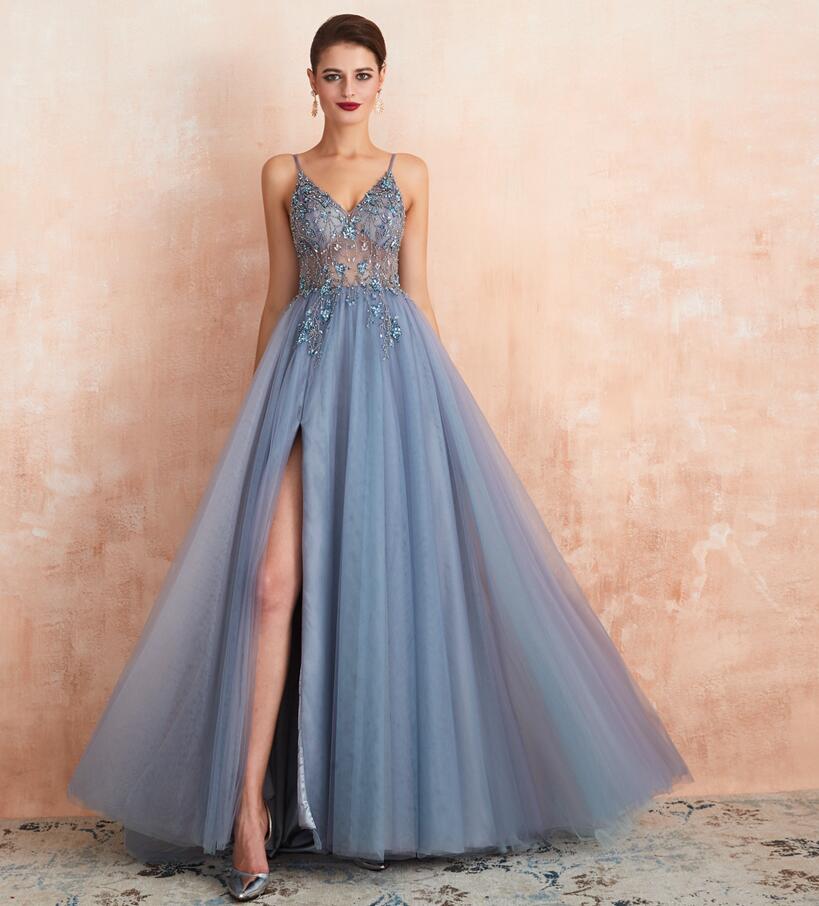 Pink Beaded Prom Dresses Plus Size 2023 Long Elegant See Through A Line Split Tulle V Neck Spaghetti Strap Evening GownSPECIFICATIONS
