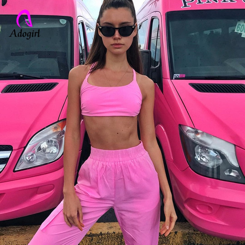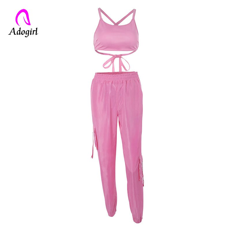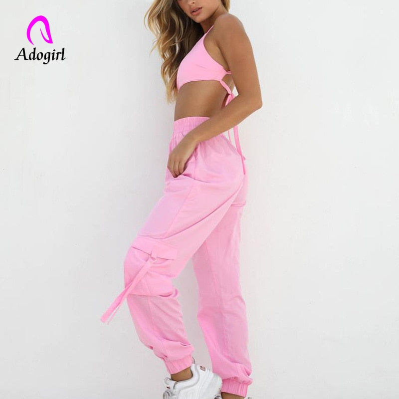 Pink Women Sports Two Pieces Gymwear Designer Women Tracksuit Joggings Spaghetti Straps Crop Top Elastic Waist Cargo Pants Set