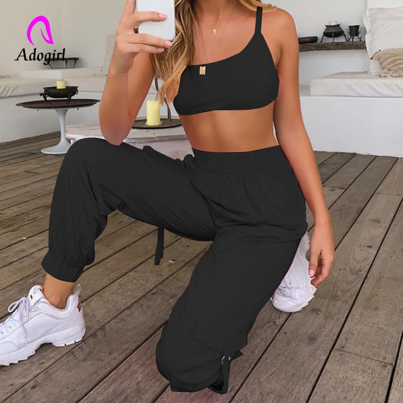 Best Selling Pink Women Sports Two Pieces Gymwear Designer Women Tracksuit Joggings Spaghetti Straps Crop Top Elastic Waist Cargo Pants Set