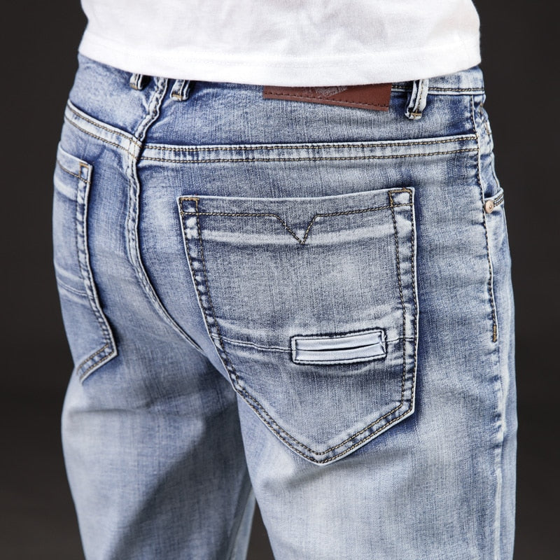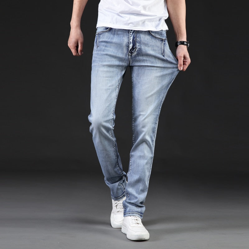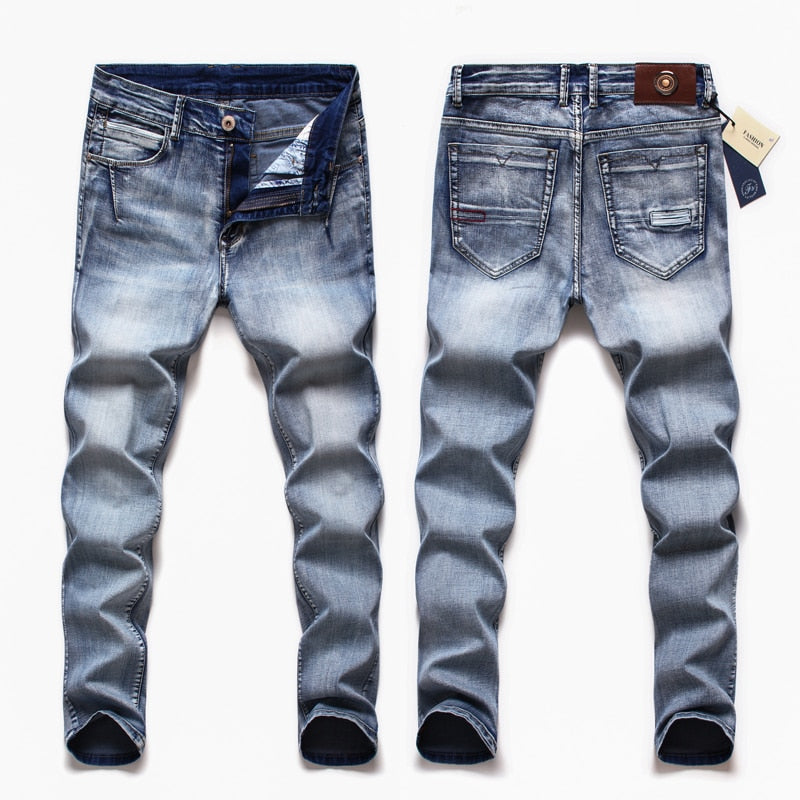 Quality Slim Jeans Men Classical Fashion Elasticity Denim Pants Light Blue Washed Brand Casual Trousers Male Plus Size 40-46
