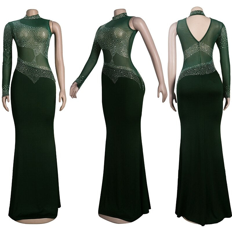 Rhinestone Women Long Maxi Dress Sheer Mesh Patchwork See Through One Shoulder Evening Party Fitness Dress Sexy Club Bodycon