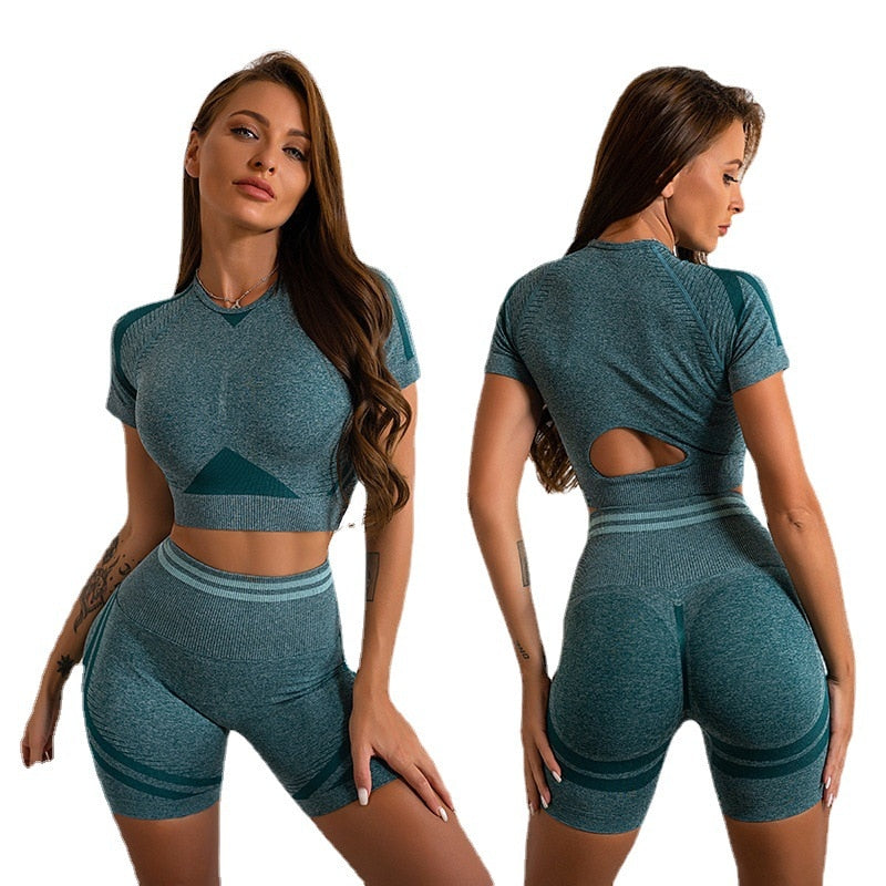 Seamless Yoga Sets Sports Fitness Peach Hip-lifting Shorts Beauty Back Short-Sleeved Suits Workout Gym Leggings Set for Women