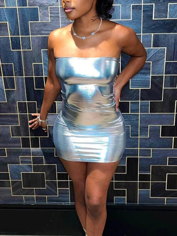 Sexy Strapless Shiny Silver Coatings Patent Leather Bodycon Dress Women Off Shoulder Skinny Mini Dress Club Party Vestidos