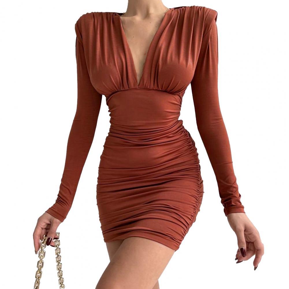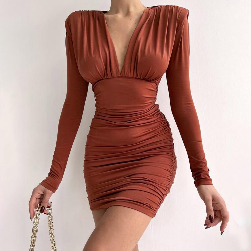 Sexy Women's Bodycon Mini Dress Padded Shoulder Deep V Neck Tight Waist Spring Dress For New Year 2022 Ladies Party Vestidos
