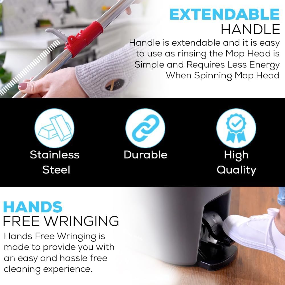 • SUPER-ABSORBENT SPINNING MOP HEADS: our spinning microfiber mop heads grab the messes so you’re not pushing the mess, but actually picking it up in the microfiber fingers. They’re super-absorbent and pick up 10x its weight in dirt and debris.