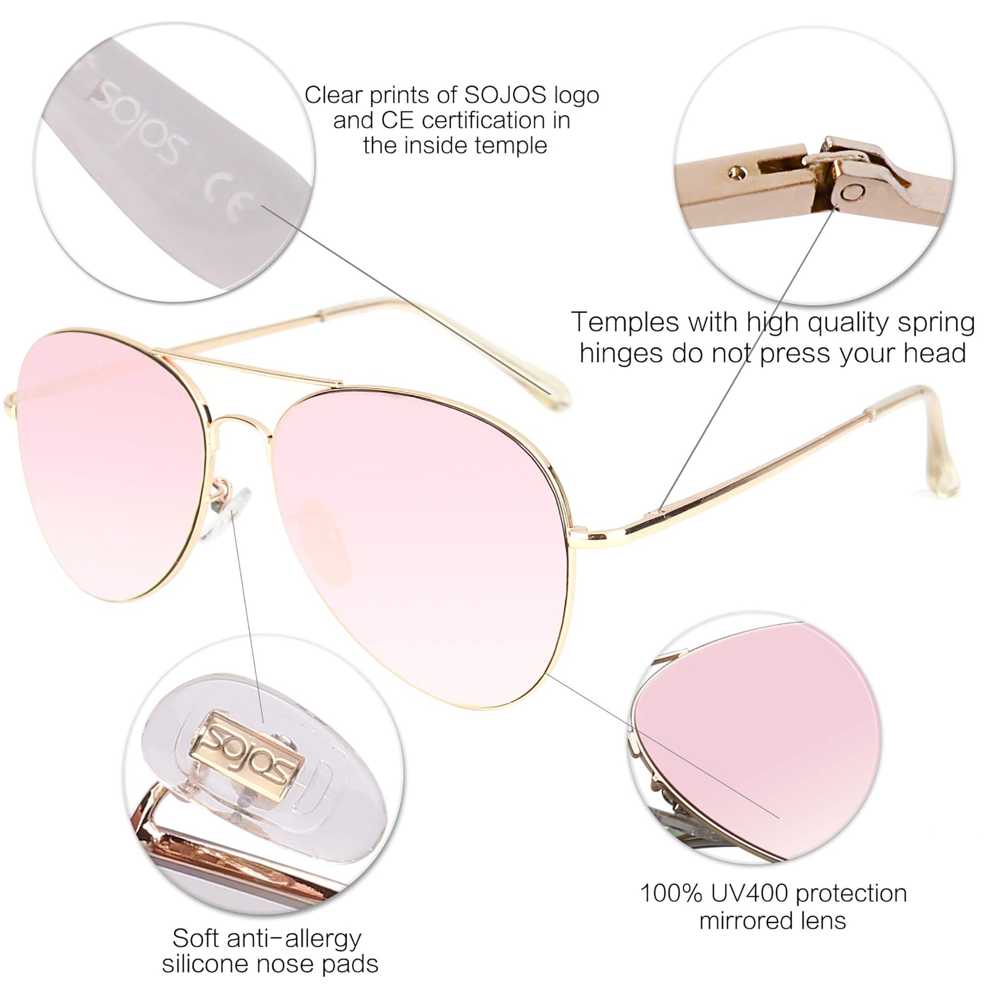 SOJOS Classic Aviator Sunglasses for Women Men Metal Frame Spring Hinges SJ1030, Gold/PinkBrand: SOJOS