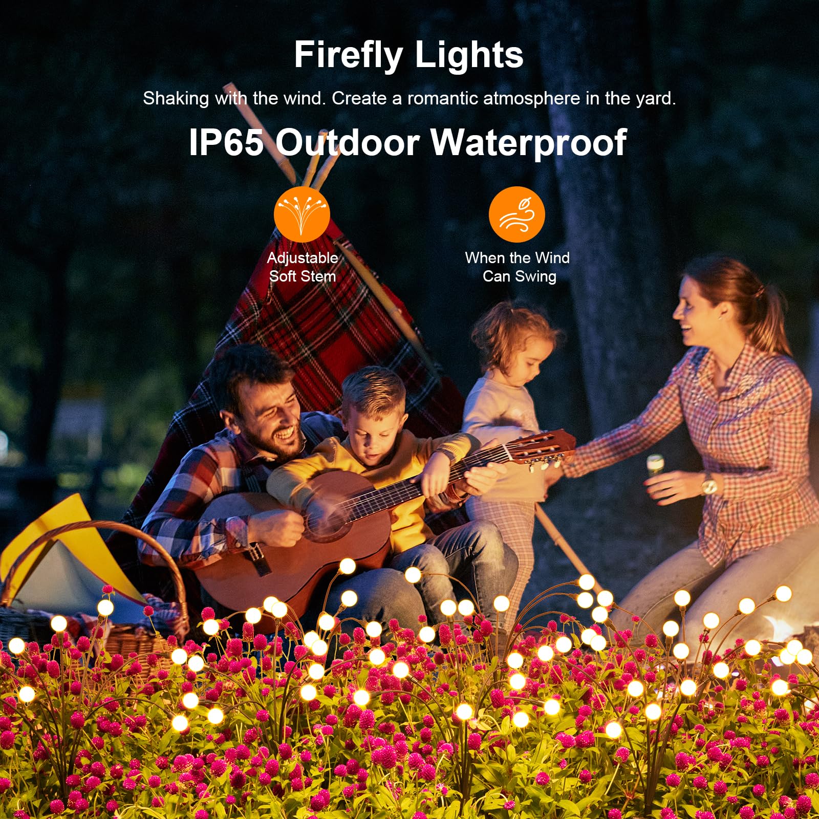 - 【Newest Designed Solar Garden Lights,Vary in Lenth,More Layered Look】 The newest and most unique solar firefly lights in the market, our solar swaying light is vary in the length of the wires making the Leds more layered look. The solar garden firefly lights with highly flexible wire and heavy-duty bulb base, featuring greater flexibility and swing angle, when the wind blows, the solar garden lights sway with it, just as real fireflies were dancing in the courtyard