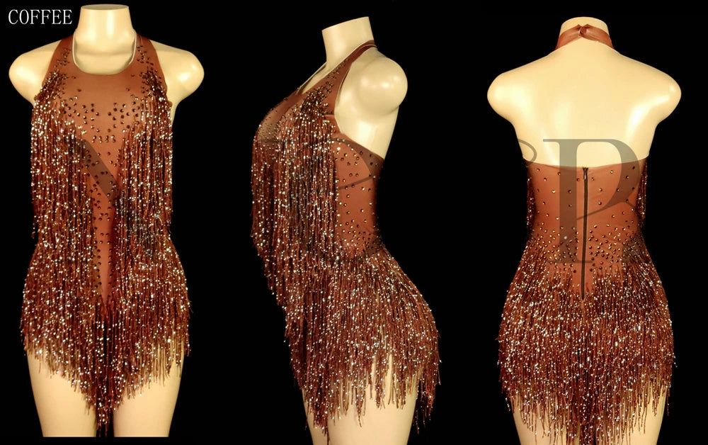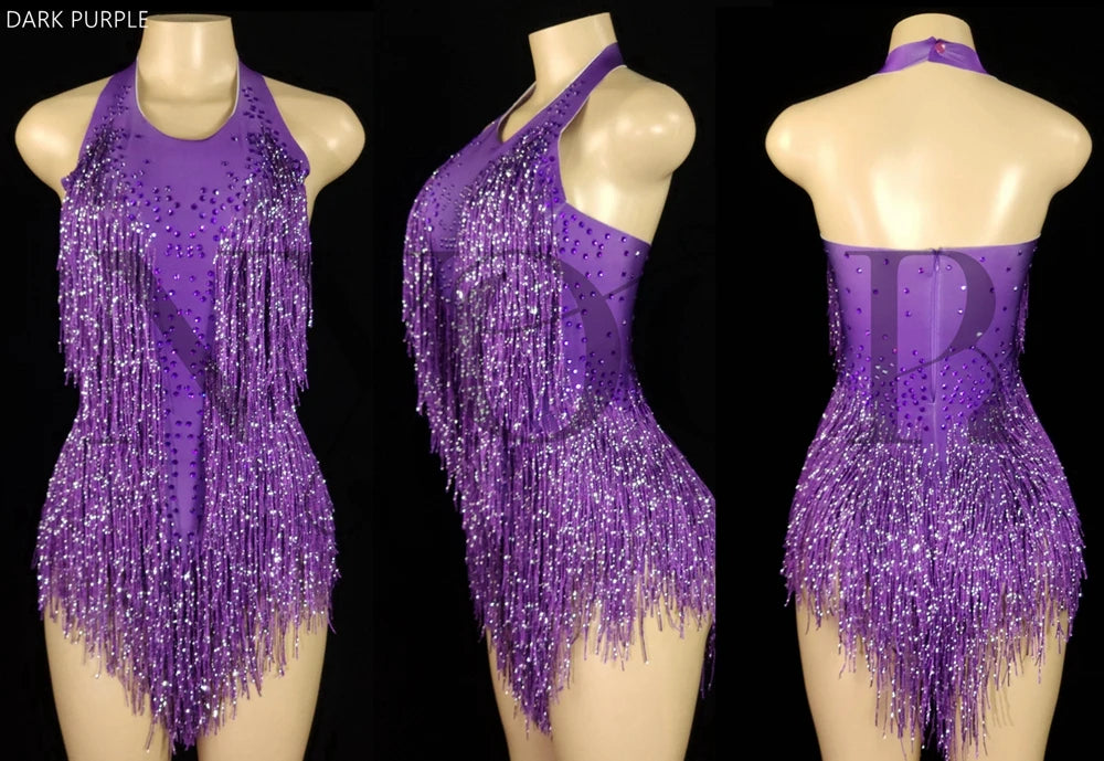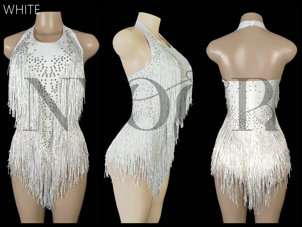Sparkly Rhinestones Fringes Leotard Women Nightclub Party Outfit Dance Costume One-piece Stage Wear Sexy Performance Bodysuit