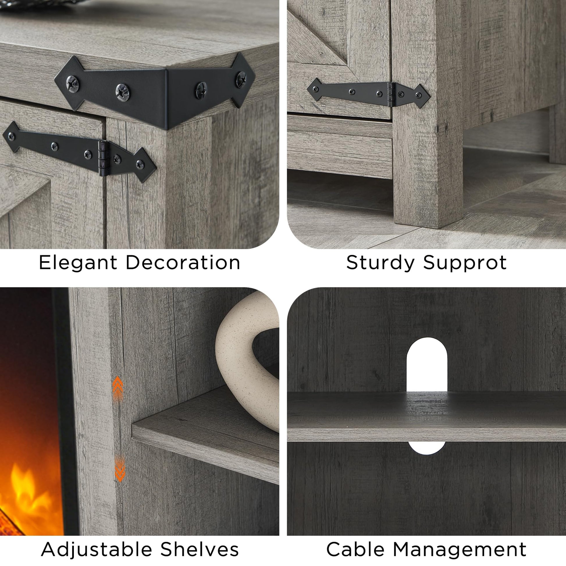- 【Storage Space with Cable Management System】2 large barn door concealed side cabinets with adjustable shelves provide plenty of space for your entertainment accessories. The spacious tabletop provides open space for media, frames, plants, books, equipment, and any other home décor. The entertainment center has cable holes designed in the back for stowing away cable extras. The tv console give you the freedom to organize the space for your items, making it a stylish entertainment center.