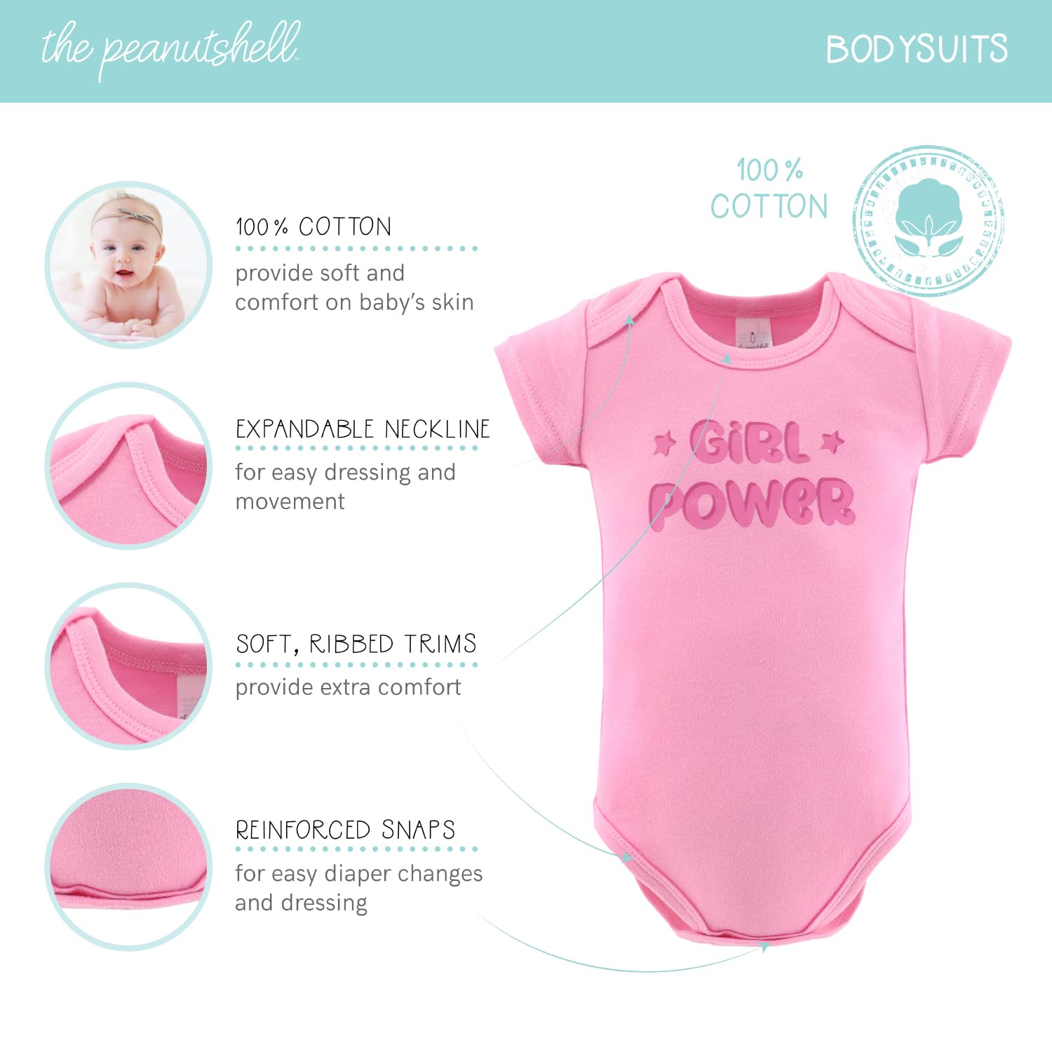 Details: Give a thoughtfully curated gift with The Pretty Pink 16 Piece Baby Layette set from The Peanutshell. This flower power themed bundle includes all essential outfit accessories for your newborn girl. Our assortment includes 3 short sleeved bodysuits, 3 headbands, 3 pairs of pants, 3 pairs of scratch mittens, 3 pairs of socks, and a sleep gown. Mix and match the vivid fuchsia, pink, and white pieces with the bold floral print to create various layered looks. This set of must haves makes the perfect baby shower gift.