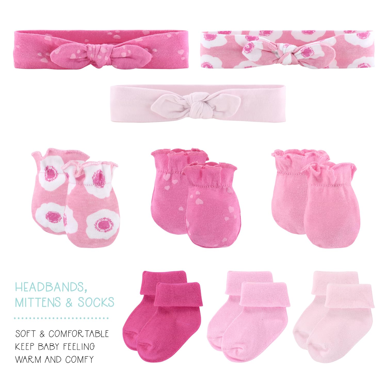 - 16 Must Have Accessories - This adorable gift set has all the clothes and accessories you need for a new born baby girl. It includes 3 short sleeve bodysuits, 3 pair of pants, 3 headbands, 3 pairs of scratch mittens, 3 pairs of socks, and a sleep gown
