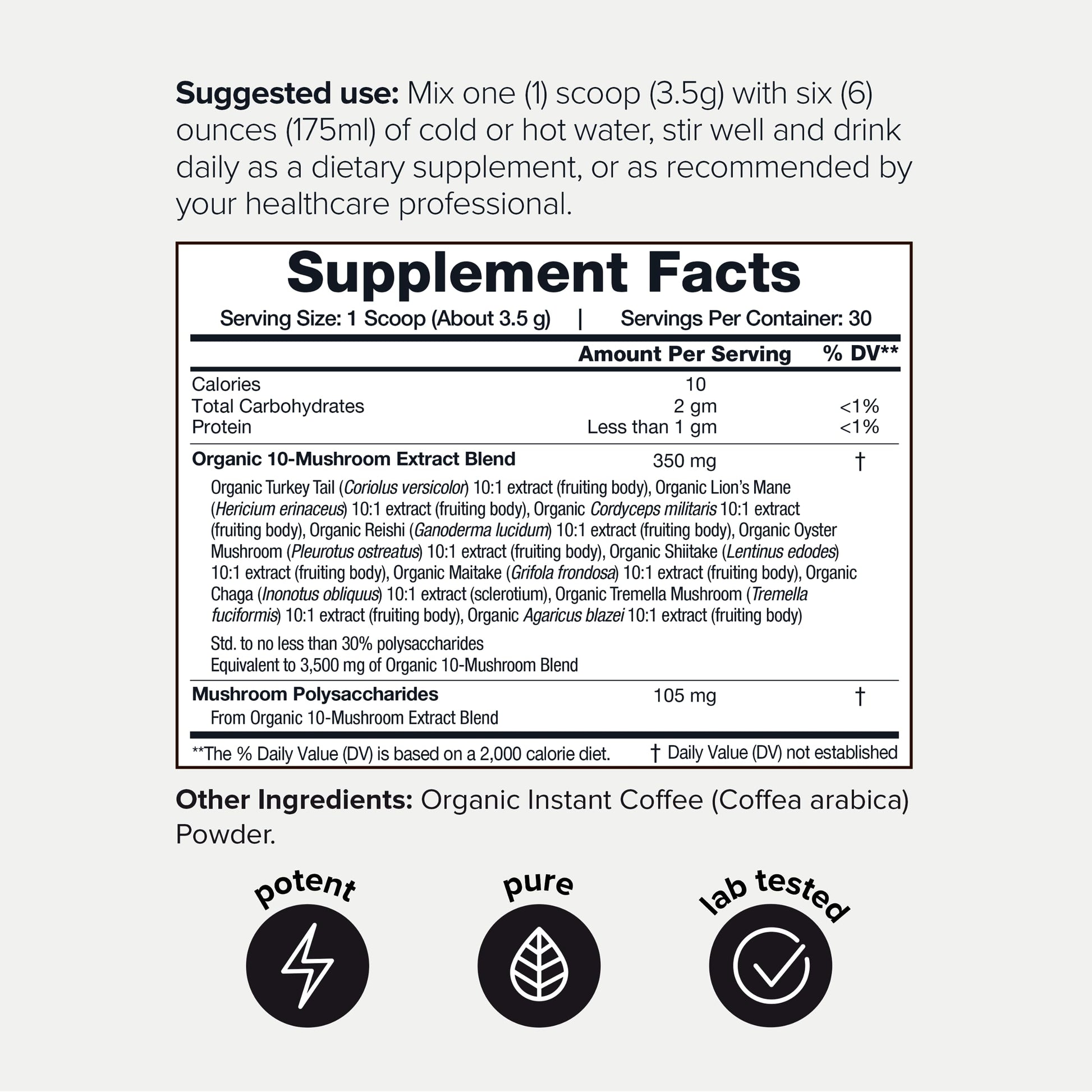 - Highly Concentrated 10 Mushroom Blend - Our Organic Mushroom Coffee blend is formulated with a 10:1 extract ratio of ten potent mushrooms: Turkey Tail, Lion’s Mane, Cordyceps, Reishi, Oyster Mushroom, Shiitake, Maitake, Chaga, Tremella, Agaricus blazei. Each serving contains a 10:1 formula for each of these mushrooms to ensure the highest levels of potency and concentrated active compounds.