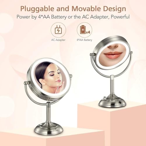 - ๐๐๐๐๐ยฐ ๐๐จ๐ญ๐๐ญ๐ข๐จ๐ง & ๐๐ฎ๐๐ฅ ๐๐จ๐ฐ๐๐ซ ๐๐ฎ๐ฉ๐ฉ๐ฅ๐ฒ โ Freely swivel the VESAUR lighted makeup mirror to perfect view angle and comfortable position. Passed over 10,000 times fatigue test, proves durability and non-loose properties of shaft rotation. โกPowered by the AC Adapter (included) or 4*AA batteries. These two methods can provide more 30% brightness than others. Easily change it between a wired and wireless makeup mirror.