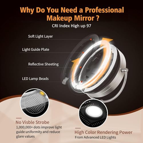 - ๐๐๐๐๐ฏ๐๐ง๐๐๐ ๐๐จ๐ง๐๐ข๐ ๐ฎ๐ซ๐๐ญ๐ข๐จ๐ง, ๐๐จ๐ซ๐ง ๐๐จ๐ซ ๐๐ซ๐จ๐๐๐ฌ๐ฌ๐ข๐จ๐ง โ 48 lamp beads provide super-bright light. Perfect for use in dimly lit areas. โกColor rendering index (CRI) exceeds 97. Others about 80. โขSoft eye-protection light source. This lighted makeup mirror with magnification passed the IE 6227 and CCC non-strobe certification. โฃFreely and precisely adjust brightness from 0 to 1200Lux.